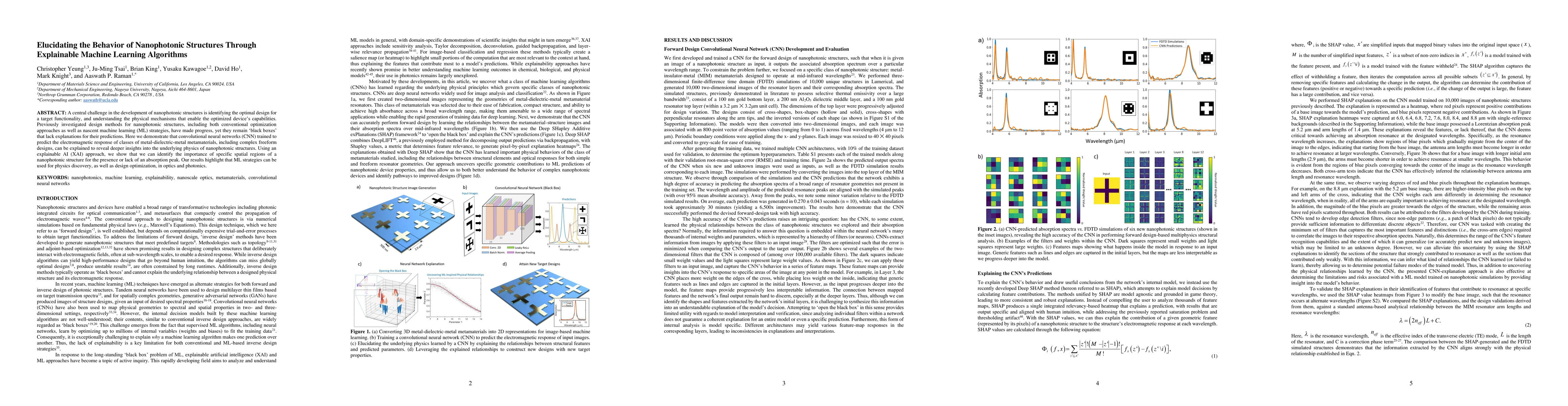 This paper uses convolutional neural networks (CNN) trained with explainable AI to elucidate the behavior of nanophotonic structures, revealing the physical mechanisms behind their electromagnetic responses and identifying critical spatial regions for absorption peaks. The study demonstrates that machine learning can aid in both physics discovery and design optimization in optics and photonics.