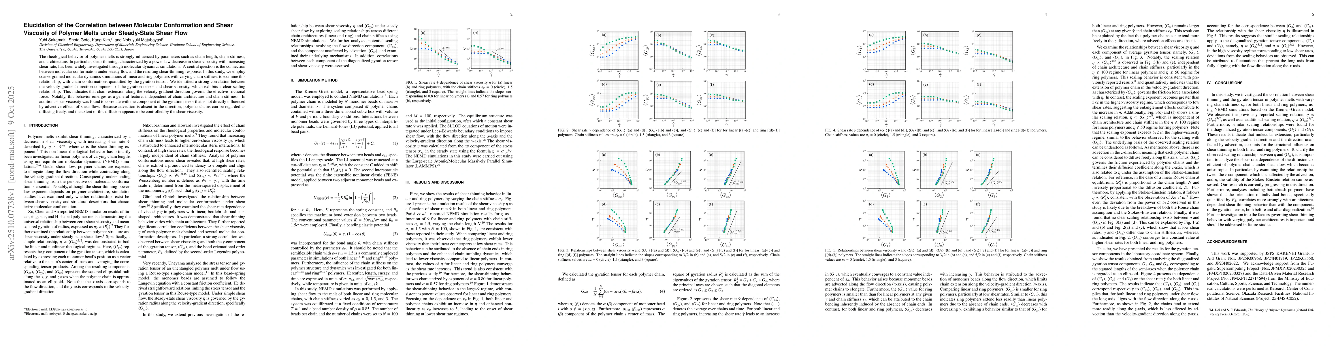 The study employed coarse-grained molecular dynamics simulations using the Kremer-Grest model to investigate the relationship between molecular conformation and shear viscosity in polymer melts under steady-state shear flow. NEMD simulations were conducted for both linear and ring polymers with varying chain stiffness.