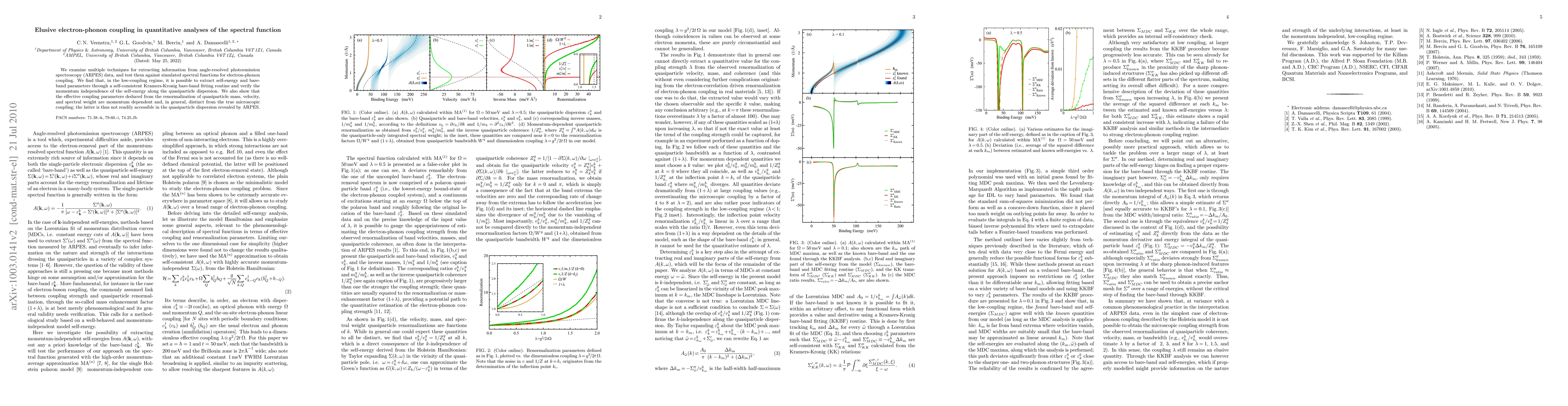 We examine multiple techniques for extracting information from angle-resolved photoemission spectroscopy (ARPES) data, and test them against simulated spectral functions for electron-phonon coupling. We find that, in the low-coupling regime, it is possible to extract self-energy and bare-band parameters through a self-consistent Kramers-Kronig bare-band fitting routine. We also show that the effective coupling parameters deduced from the renormalization of quasiparticle mass, velocity, and spectral weight are momentum dependent and, in general, distinct from the true microscopic coupling; the latter is thus not readily accessible in the quasiparticle dispersion revealed by ARPES.