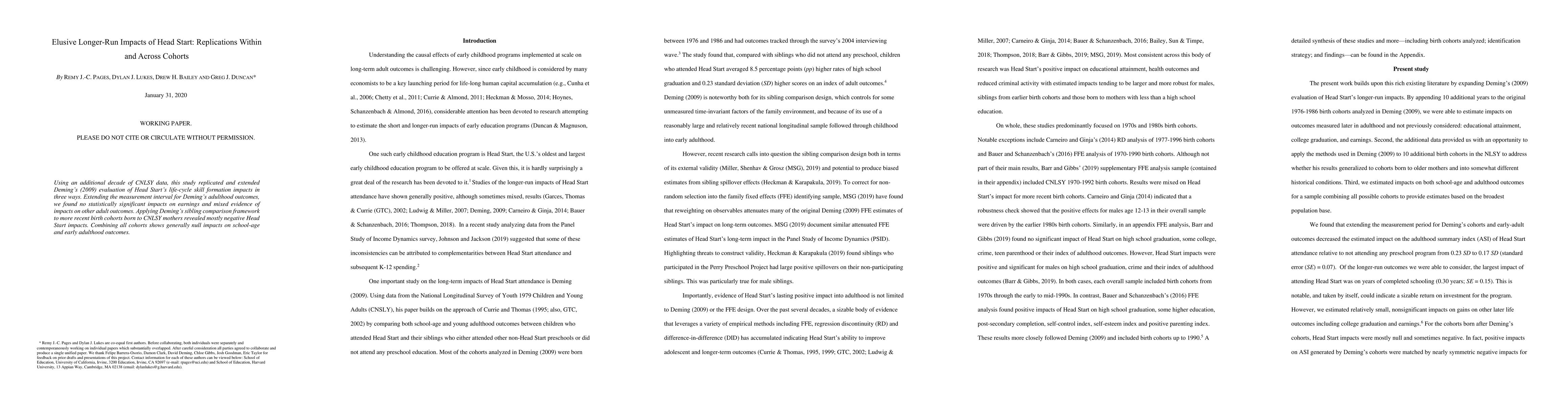 Using an additional decade of CNLSY data, this study replicated and extended Deming's (2009) evaluation of Head Start's life-cycle skill formation impacts in three ways. Extending the measurement interval for Deming's adulthood outcomes, we found no statistically significant impacts on earnings and mixed evidence of impacts on other adult outcomes. Applying Deming's sibling comparison framework to more recent birth cohorts born to CNLSY mothers revealed mostly negative Head Start impacts. Combining all cohorts shows generally null impacts on school-age and early adulthood outcomes.