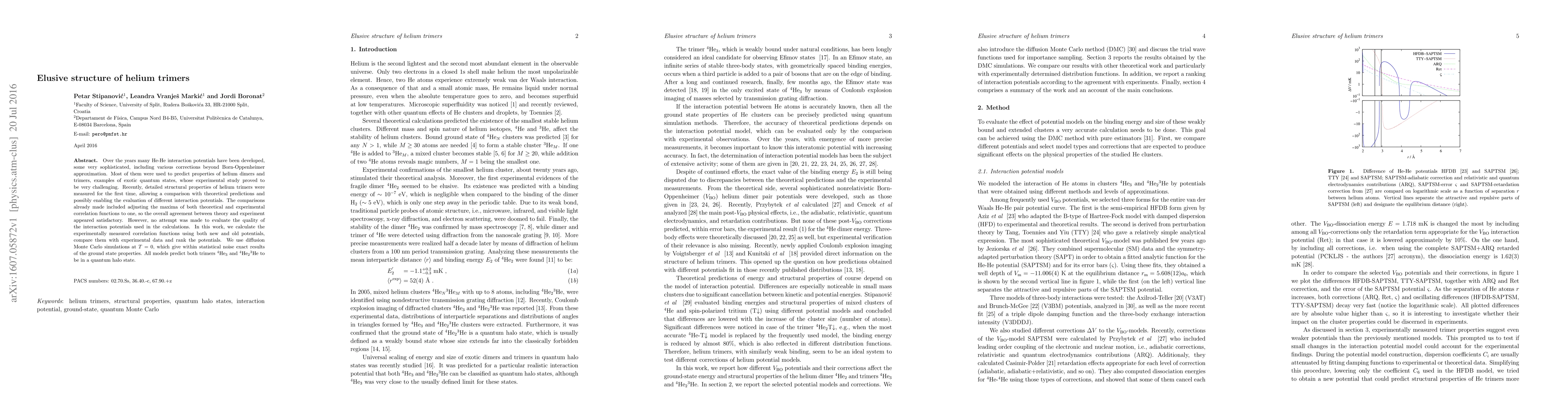 This study compares various helium trimer interaction potentials with recently measured structural properties, using diffusion Monte Carlo simulations for exact ground state calculations. The findings reveal that all models predict halo states for both $^4mathrm{He}_{3}$ and $^4mathrm{He}_2{}^3mathrm{He}$ trimers, and rank the potentials based on their agreement with experimental data.