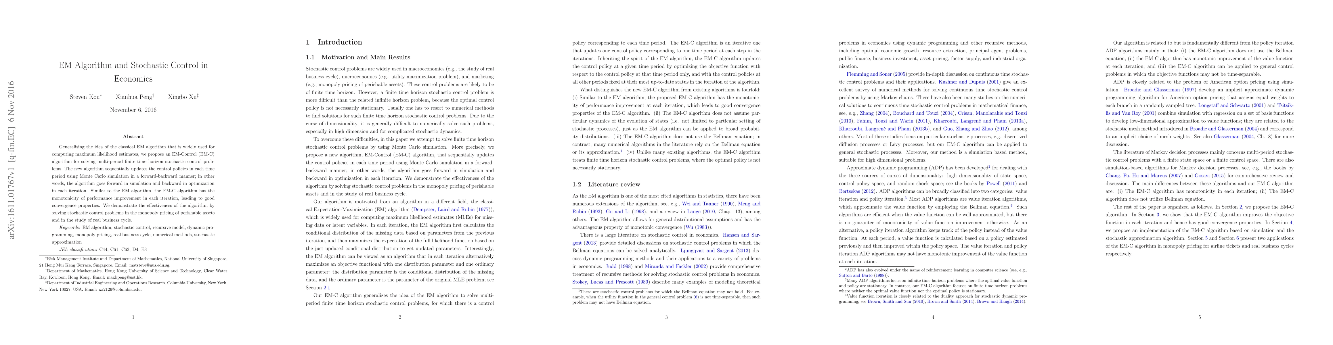 This paper proposes an EM-Control (EM-C) algorithm for solving multi-period stochastic control problems, generalizing the classical EM algorithm. The EM-C algorithm updates control policies using Monte Carlo simulation in a forward-backward manner, demonstrating good convergence properties and effectiveness through applications in monopoly pricing and real business cycle studies.