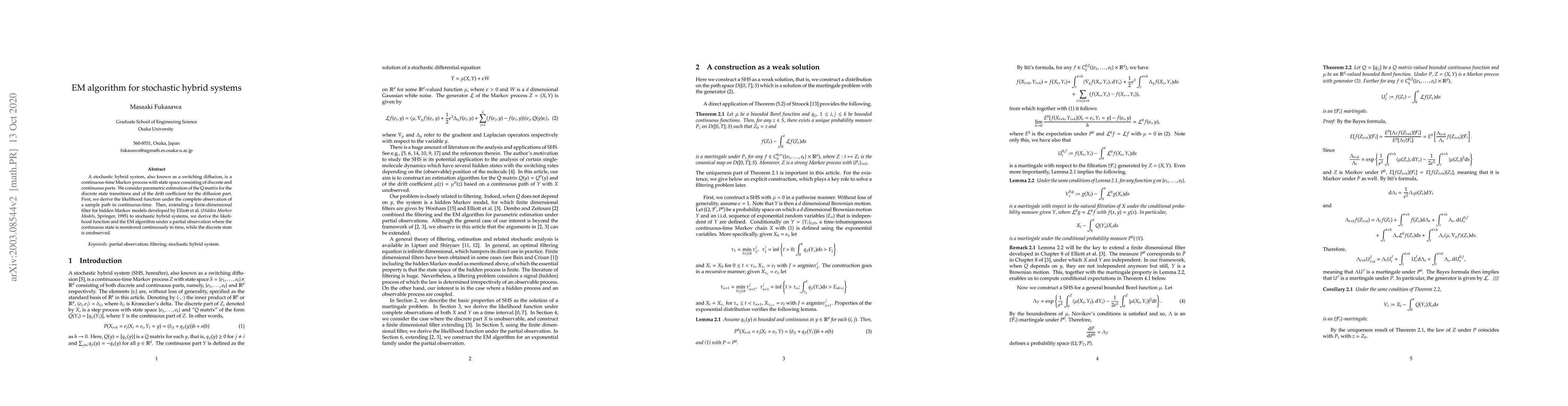 A stochastic hybrid system, also known as a switching diffusion, is a continuous-time Markov process with state space consisting of discrete and continuous parts. We consider parametric estimation of theQmatrix for the discrete state transitions and of the drift coefficient for the diffusion part. First, we derive the likelihood function under the complete observation of a sample path in continuous-time. Then, extending a finite-dimensional filter for hidden Markov models developed by Elliott et al. (Hidden Markov Models, Springer, 1995) to stochastic hybrid systems, we derive the likelihood function and the EM algorithm under a partial observation where the continuous state is monitored continuously in time, while the discrete state is unobserved.
