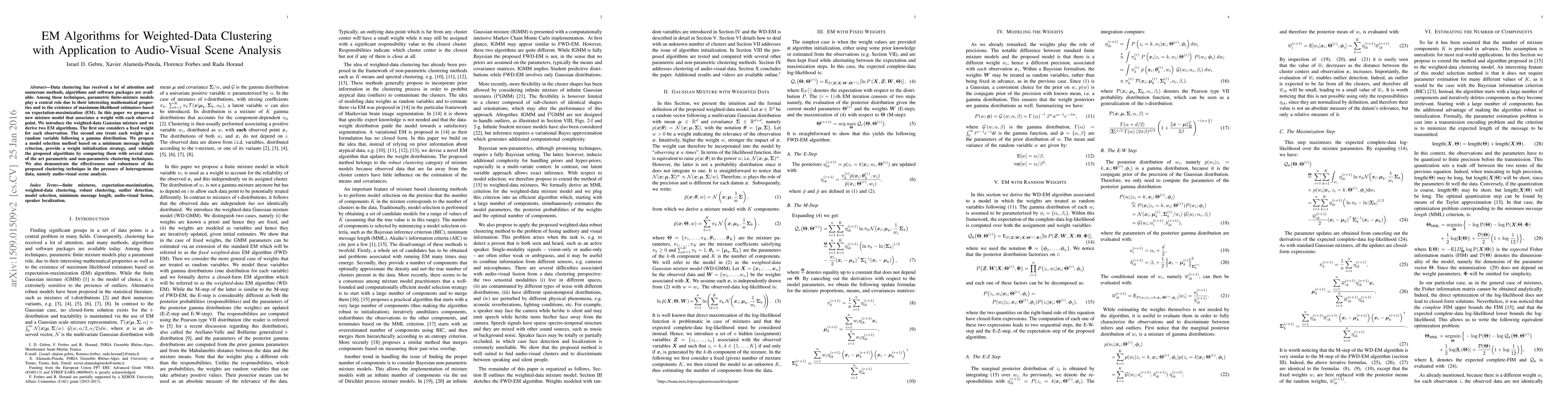 This paper introduces a new weighted-data Gaussian mixture model for clustering, derived through two EM algorithms. One considers fixed observation weights, while the other treats weights as random variables following a gamma distribution. The authors propose a model selection method and weight initialization strategy, validating their approach by comparing it to state-of-the-art clustering techniques. The method's effectiveness and robustness are demonstrated in audio-visual scene analysis with heterogeneous data.