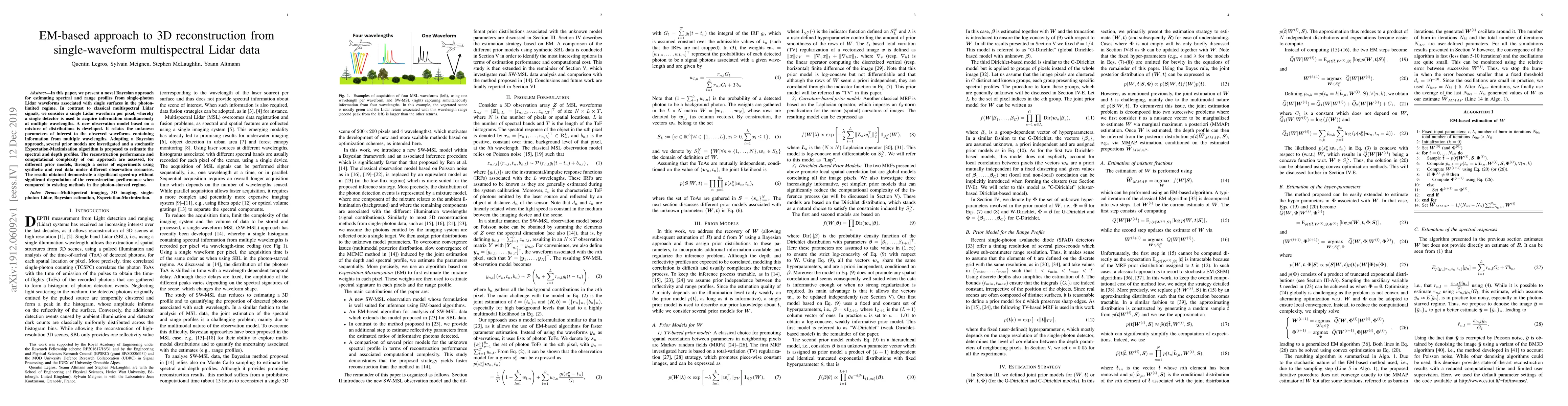 This paper introduces a Bayesian EM-based approach for 3D reconstruction from single-waveform multispectral Lidar data, utilizing a novel observation model based on a mixture of distributions. The proposed method achieves faster reconstruction with comparable performance compared to existing techniques in photon-limited conditions.