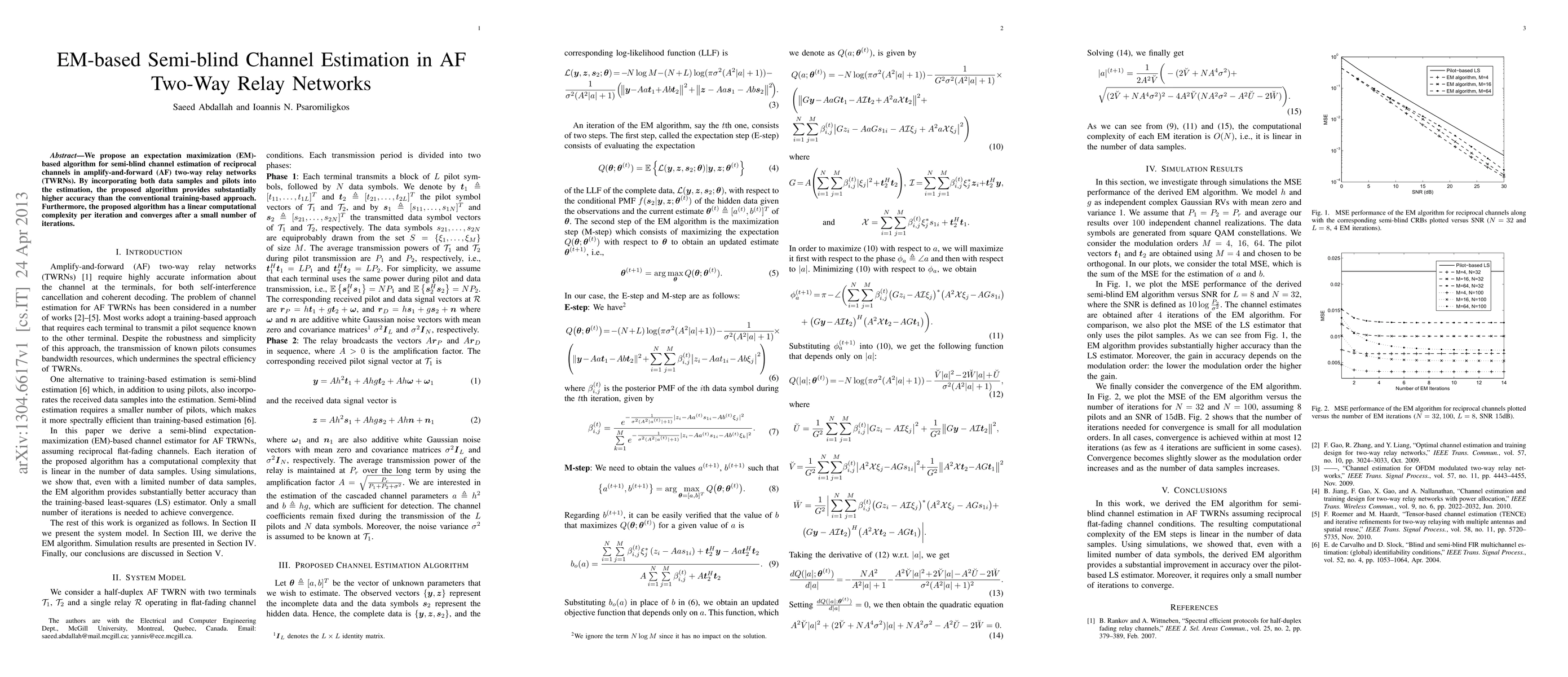 This paper introduces an EM-based algorithm for semi-blind channel estimation in AF TWRNs, combining data samples and pilots for improved accuracy. The method exhibits linear computational complexity and converges quickly.