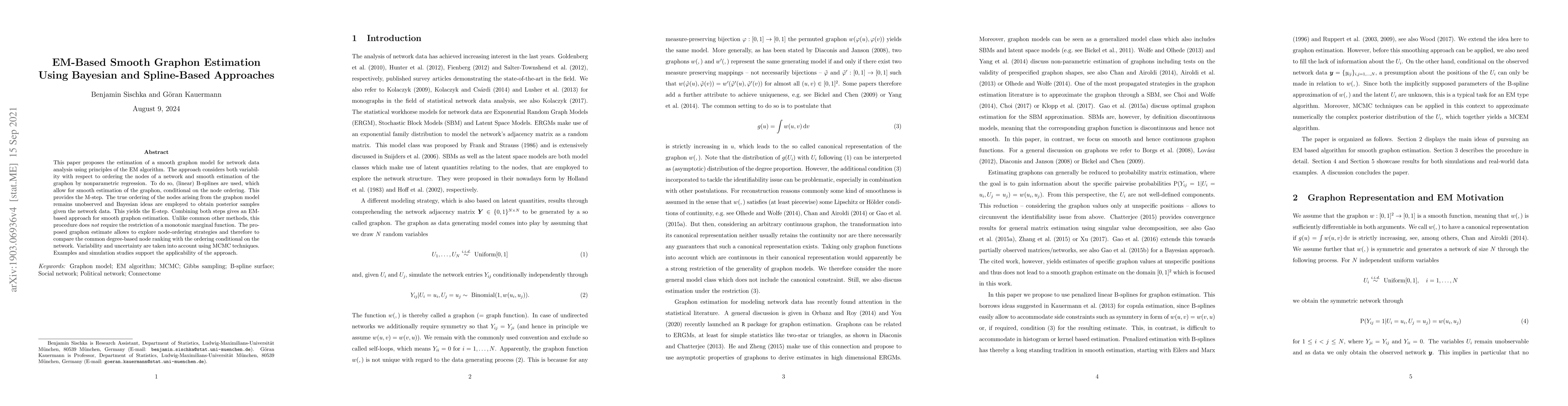 This paper introduces an EM algorithm for estimating smooth graphons in network data using Bayesian and spline-based methods, allowing for flexible node ordering and nonparametric regression with B-splines. The approach combines E-step Bayesian inference with M-step spline estimation to handle unobserved node orderings, supported by MCMC for variability and uncertainty.