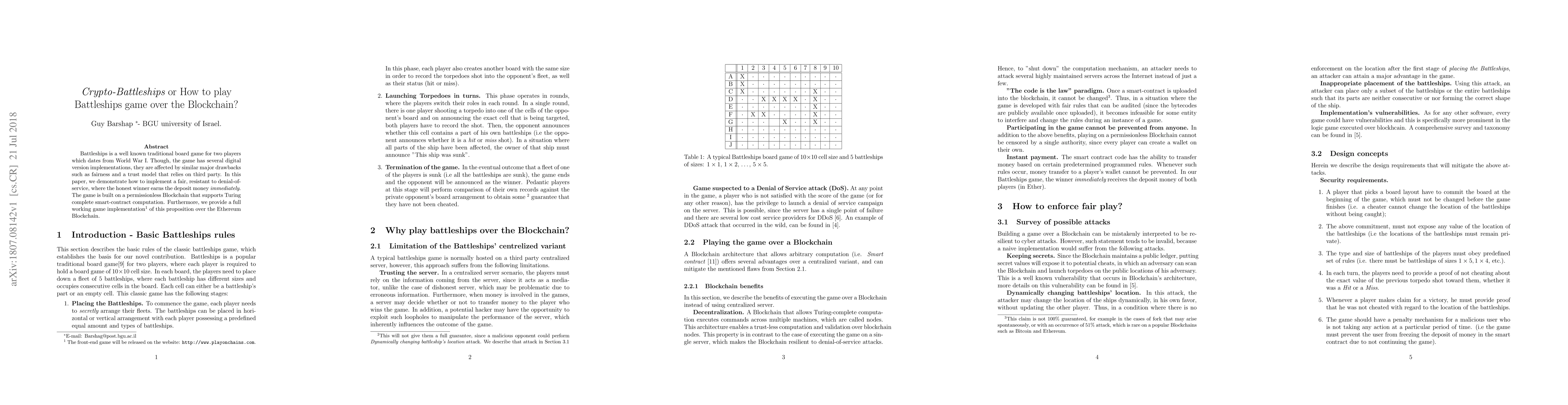 Battleships is a well known traditional board game for two players which dates from World War I. Though, the game has several digital version implementations, they are affected by similar major drawbacks such as fairness and a trust model that relies on third party. In this paper, we demonstrate how to implement a fair, resistant to denial-of-service, where the honest winner earns the deposit money {\em immediately}. The game is built on a permissionless Blockchain that supports Turing complete smart-contract computation.