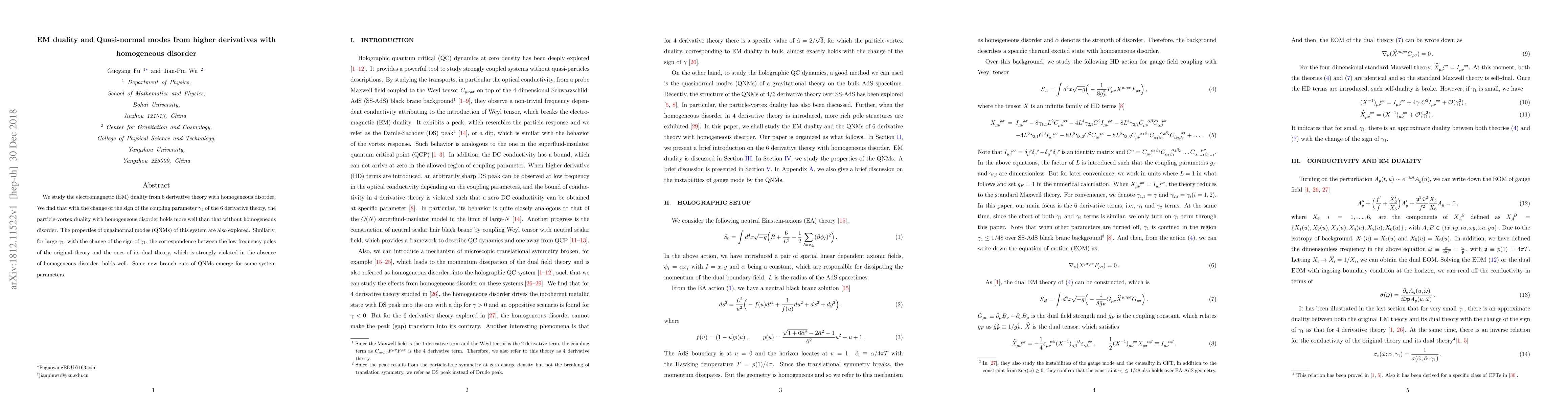 This paper investigates electromagnetic duality in a $6$ derivative theory with homogeneous disorder, finding enhanced particle-vortex duality when the coupling parameter $\gamma_1$ changes sign. The study also explores quasi-normal modes, revealing new branch cuts and improved correspondence between low frequency poles in the original and dual theories under certain conditions.