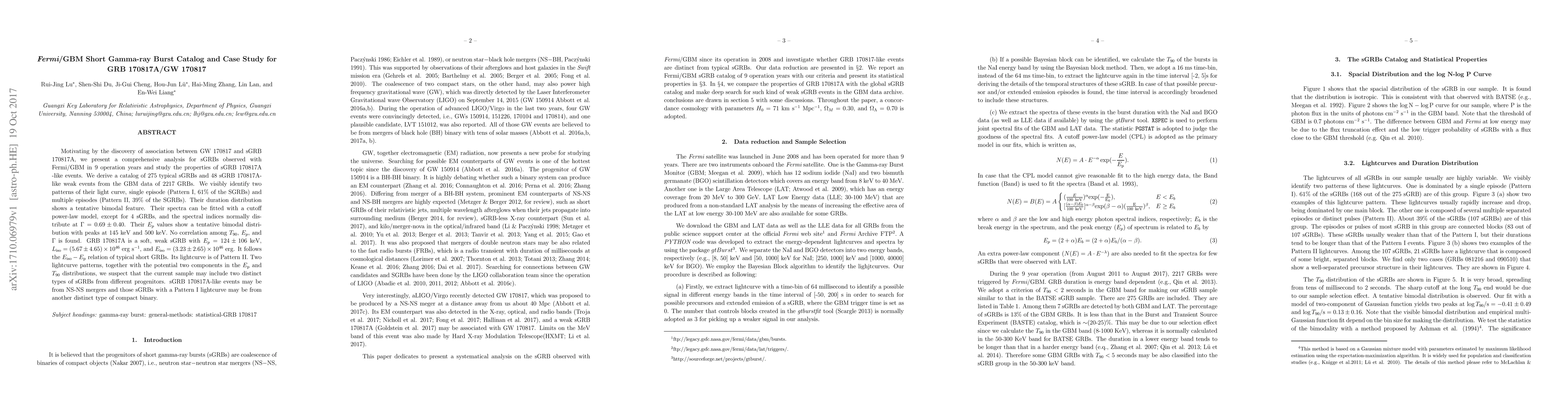 The paper presents a catalog of 275 typical short gamma-ray bursts (sGRBs) and 48 sGRB 170817A-like weak events from Fermi/GBM data, identifying two light curve patterns and tentative bimodal spectral features, suggesting two distinct sGRB types. The study highlights GRB 170817A as a soft, weak sGRB consistent with typical sGRBs, potentially from a neutron star merger.