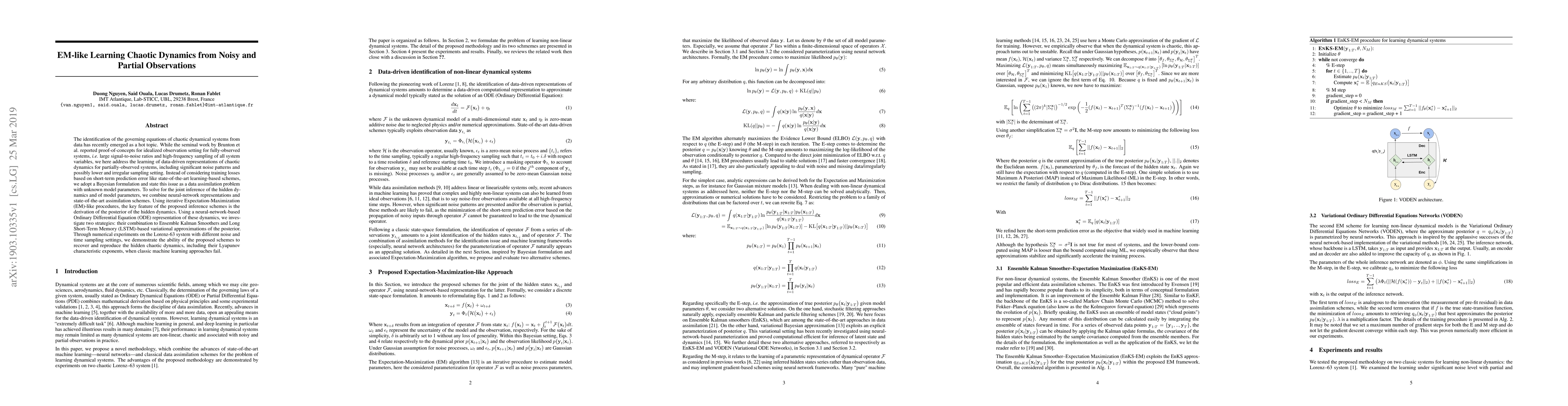 The identification of the governing equations of chaotic dynamical systems from data has recently emerged as a hot topic. While the seminal work by Brunton et al. reported proof-of-concepts for idealized observation setting for fully-observed systems, {\em i.e.} large signal-to-noise ratios and high-frequency sampling of all system variables, we here address the learning of data-driven representations of chaotic dynamics for partially-observed systems, including significant noise patterns and possibly lower and irregular sampling setting. Instead of considering training losses based on short-term prediction error like state-of-the-art learning-based schemes, we adopt a Bayesian formulation and state this issue as a data assimilation problem with unknown model parameters. To solve for the joint inference of the hidden dynamics and of model parameters, we combine neural-network representations and state-of-the-art assimilation schemes. Using iterative Expectation-Maximization (EM)-like procedures, the key feature of the proposed inference schemes is the derivation of the posterior of the hidden dynamics. Using a neural-network-based Ordinary Differential Equation (ODE) representation of these dynamics, we investigate two strategies: their combination to Ensemble Kalman Smoothers and Long Short-Term Memory (LSTM)-based variational approximations of the posterior. Through numerical experiments on the Lorenz-63 system with different noise and time sampling settings, we demonstrate the ability of the proposed schemes to recover and reproduce the hidden chaotic dynamics, including their Lyapunov characteristic exponents, when classic machine learning approaches fail.
