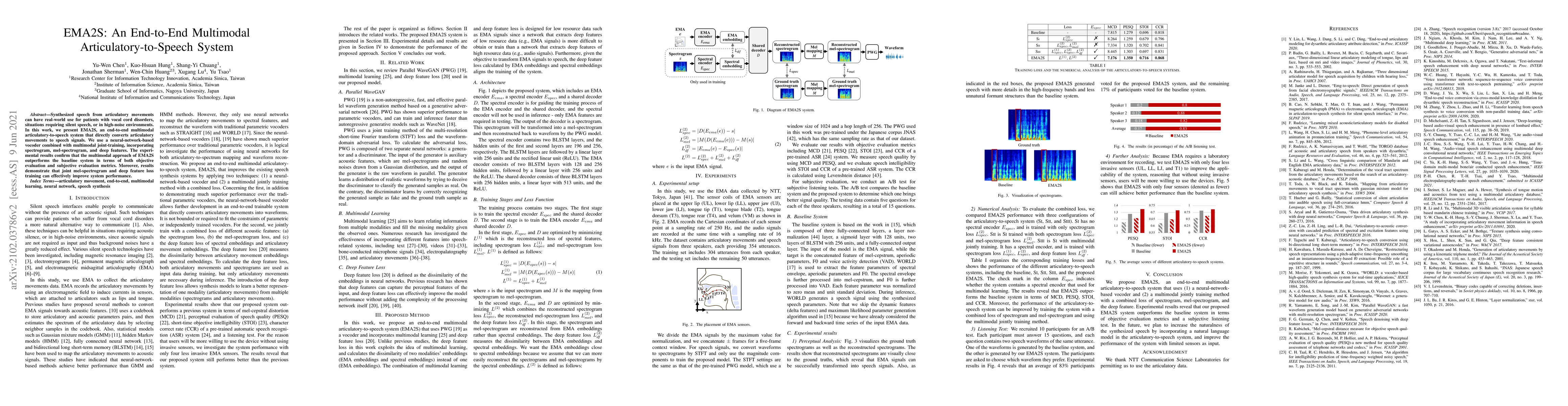 EMA2S is an end-to-end multimodal system converting articulatory movements to speech, utilizing neural networks and joint-training for enhanced performance. Experimental results show superior outcomes compared to baseline systems, particularly with joint training of mel-spectrogram and deep features.
