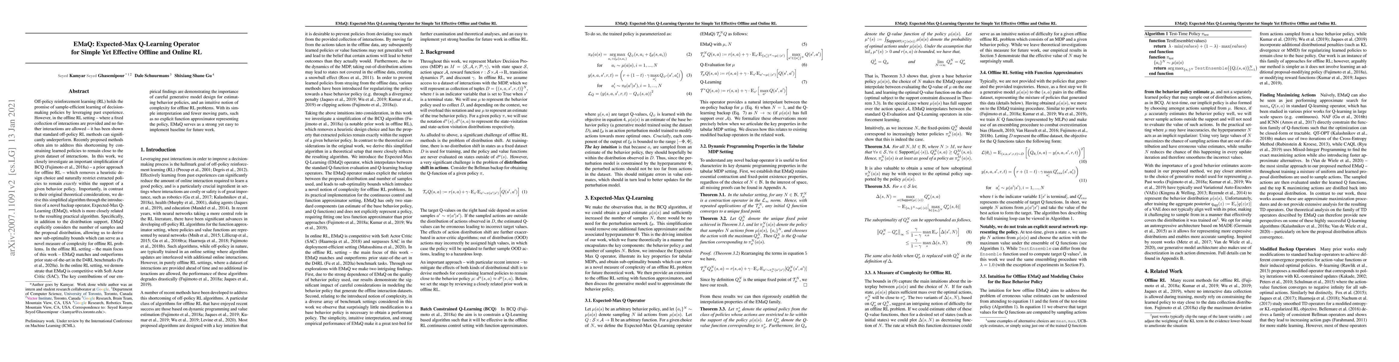 Off-policy reinforcement learning holds the promise of sample-efficient learning of decision-making policies by leveraging past experience. However, in the offline RL setting -- where a fixed collection of interactions are provided and no further interactions are allowed -- it has been shown that standard off-policy RL methods can significantly underperform. Recently proposed methods often aim to address this shortcoming by constraining learned policies to remain close to the given dataset of interactions. In this work, we closely investigate an important simplification of BCQ -- a prior approach for offline RL -- which removes a heuristic design choice and naturally restricts extracted policies to remain exactly within the support of a given behavior policy. Importantly, in contrast to their original theoretical considerations, we derive this simplified algorithm through the introduction of a novel backup operator, Expected-Max Q-Learning (EMaQ), which is more closely related to the resulting practical algorithm. Specifically, in addition to the distribution support, EMaQ explicitly considers the number of samples and the proposal distribution, allowing us to derive new sub-optimality bounds which can serve as a novel measure of complexity for offline RL problems. In the offline RL setting -- the main focus of this work -- EMaQ matches and outperforms prior state-of-the-art in the D4RL benchmarks. In the online RL setting, we demonstrate that EMaQ is competitive with Soft Actor Critic. The key contributions of our empirical findings are demonstrating the importance of careful generative model design for estimating behavior policies, and an intuitive notion of complexity for offline RL problems. With its simple interpretation and fewer moving parts, such as no explicit function approximator representing the policy, EMaQ serves as a strong yet easy to implement baseline for future work.