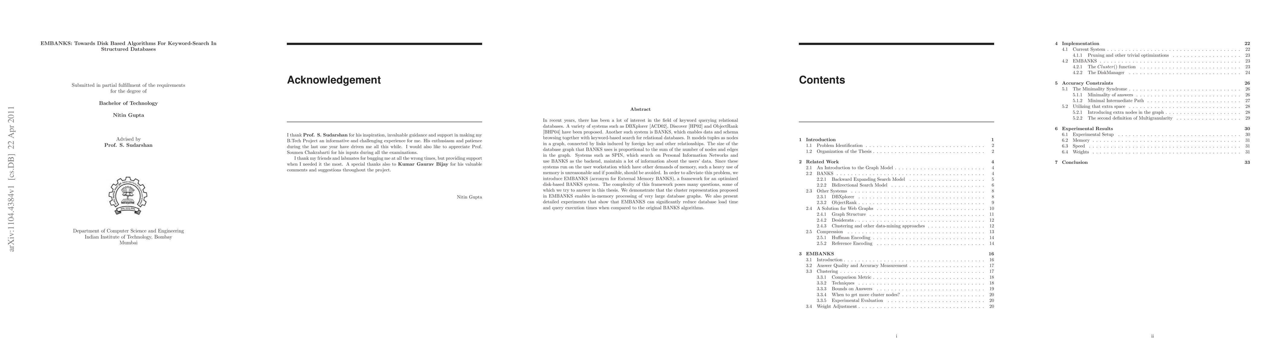 EMBANKS introduces a disk-based framework for optimizing keyword-search in structured databases, addressing the memory constraints of systems like BANKS. It demonstrates significant reductions in database load time and query execution times compared to the original BANKS algorithms through its cluster representation.