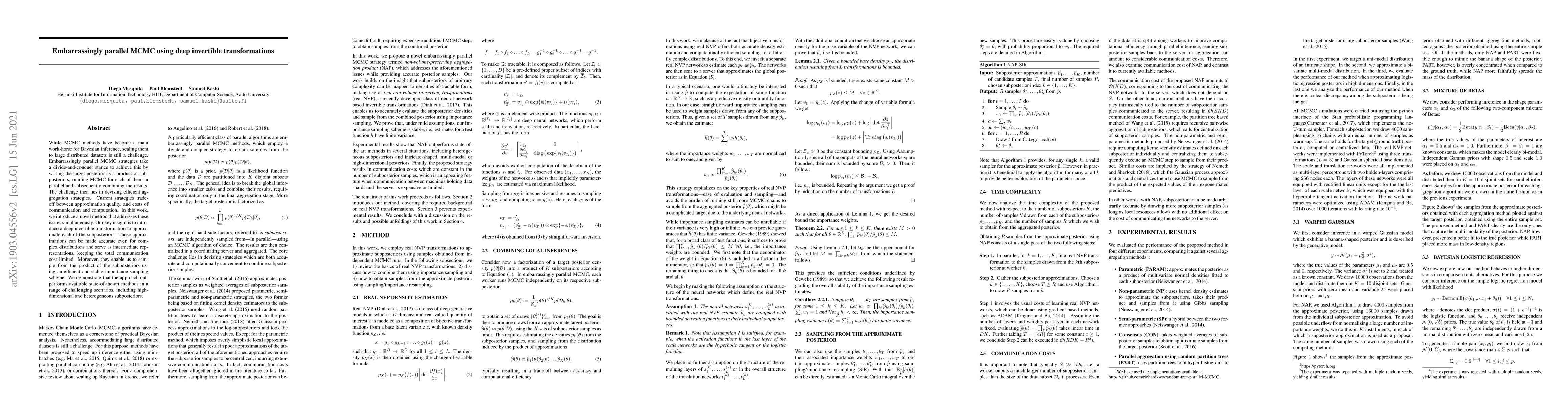 This paper proposes an embarrassingly parallel MCMC method using deep invertible transformations to address the scalability challenges of MCMC for large datasets. It introduces an efficient aggregation strategy that leverages accurate approximations of subposteriors to minimize communication costs and improve sampling efficiency.