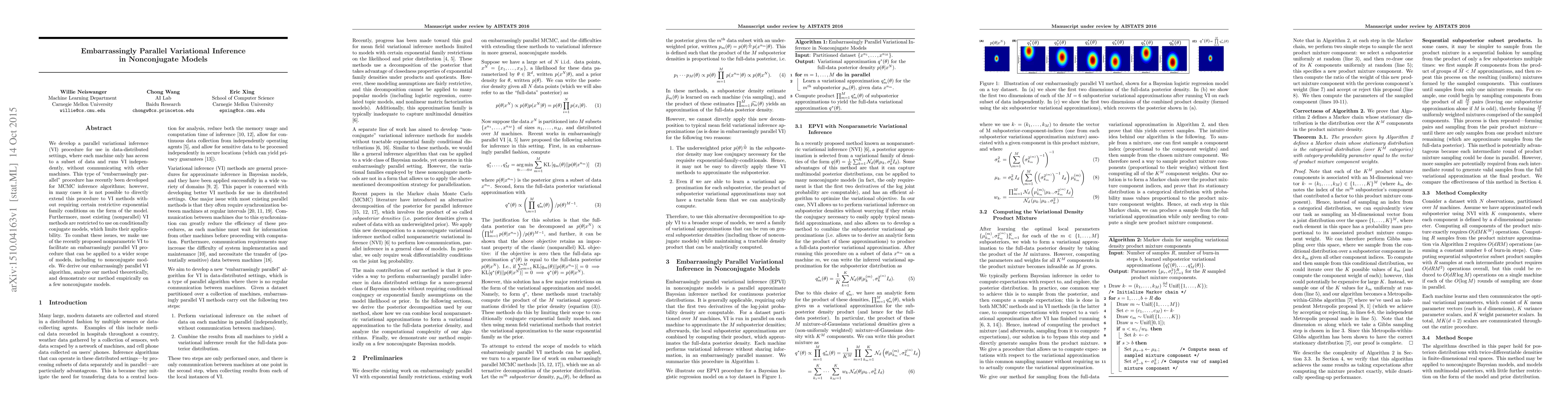 This paper introduces an embarrassingly parallel variational inference (VI) procedure for nonconjugate models, enabling independent VI runs on subsets of data without communication between machines. It leverages nonparametric VI to extend parallelizability beyond the restrictive exponential family conditions and conditionally conjugate models.