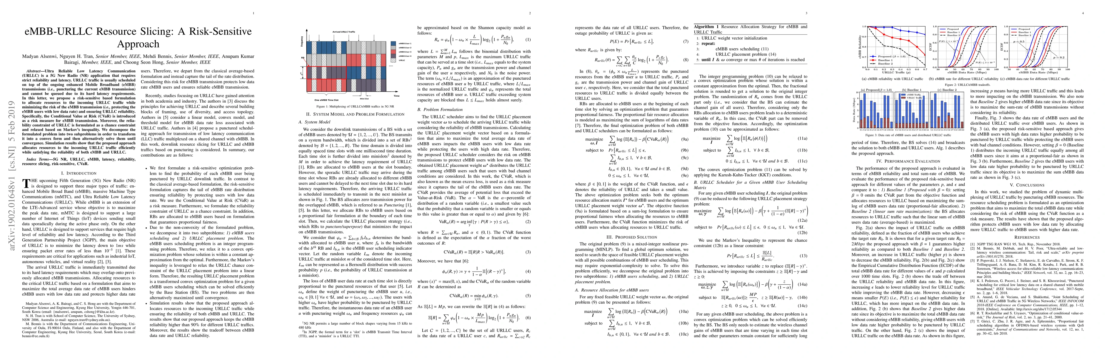 The paper proposes a risk-sensitive resource allocation method for 5G networks, balancing Ultra Reliable Low Latency Communication (URLLC) and enhanced Mobile Broadband (eMBB). It introduces Conditional Value at Risk (CVaR) for eMBB reliability and a chance constraint for URLLC, solved via convex optimization. Simulation results indicate efficient resource allocation for both eMBB and URLLC.