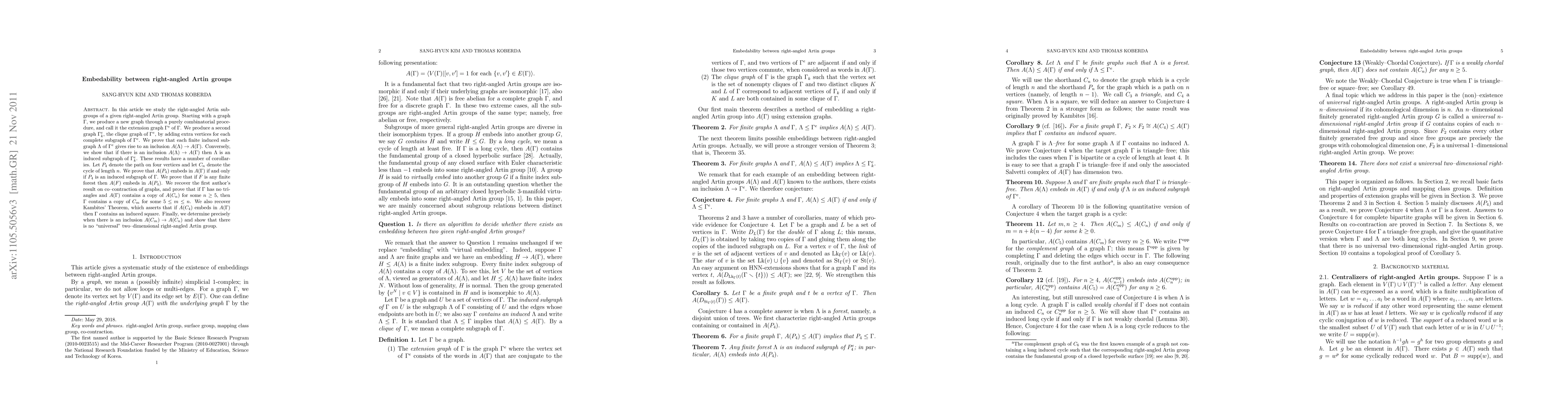 In this article we study the right-angled Artin subgroups of a given right-angled Artin group. Starting with a graph $\gam$, we produce a new graph through a purely combinatorial procedure, and call it the extension graph $\gam^e$ of $\gam$. We produce a second graph $\gam^e_k$, the clique graph of $\gam^e$, by adding extra vertices for each complete subgraph of $\gam^e$. We prove that each finite induced subgraph $\Lambda$ of $\gam^e$ gives rise to an inclusion $A(\Lambda)\to A(\gam)$. Conversely, we show that if there is an inclusion $A(\Lambda)\to A(\gam)$ then $\Lambda$ is an induced subgraph of $\gam^e_k$. These results have a number of corollaries. Let $P_4$ denote the path on four vertices and let $C_n$ denote the cycle of length $n$. We prove that $A(P_4)$ embeds in $A(\gam)$ if and only if $P_4$ is an induced subgraph of $\gam$. We prove that if $F$ is any finite forest then $A(F)$ embeds in $A(P_4)$. We recover the first author's result on co--contraction of graphs and prove that if $\gam$ has no triangles and $A(\gam)$ contains a copy of $A(C_n)$ for some $n\geq 5$, then $\gam$ contains a copy of $C_m$ for some $5\le m\le n$. We also recover Kambites' Theorem, which asserts that if $A(C_4)$ embeds in $A(\gam)$ then $\gam$ contains an induced square. Finally, we determine precisely when there is an inclusion $A(C_m)\to A(C_n)$ and show that there is no "universal" two--dimensional right-angled Artin group.