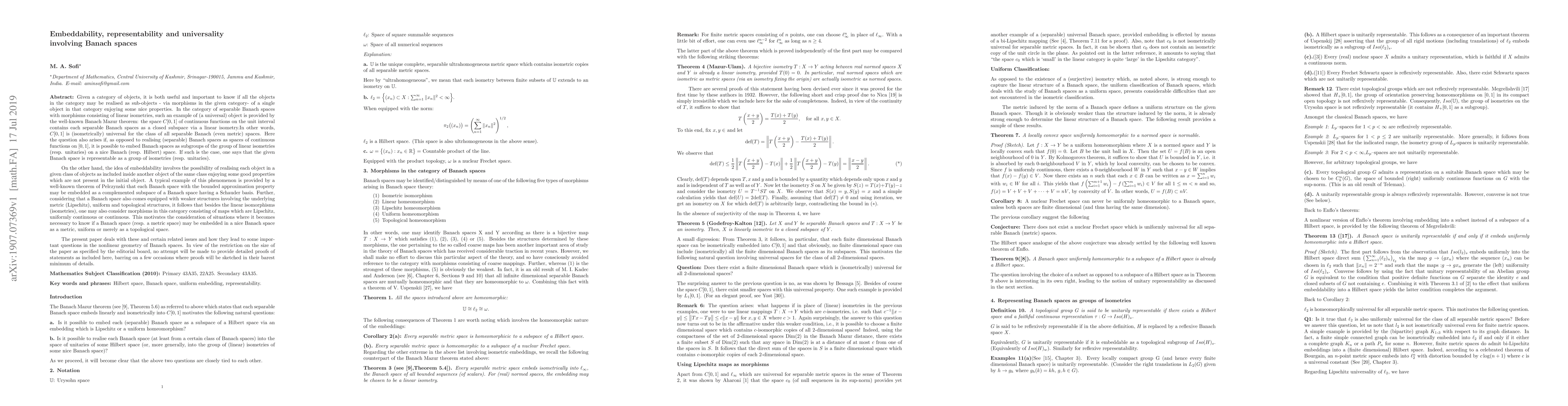 Given a category of objects, it is both useful and important to know if all the objects in the category may be realised as sub-objects -- via morphisms in the given category -- of a single object in that category enjoying some nice properties. In the category of separable Banach spaces with morphisms consisting of linear isometries, such an example of (a universal) object is provided by the well-known Banach Mazur theorem: the space C[0,1] of continuous functions on the unit interval contains each separable Banach spaces as a closed subspace via a linear isometry. Here the question also arises if, as opposed to realising (separable) Banach spaces as spaces of continuous functions on [0, 1], it is possible to embed a Banach space as a subgroup of the group of linear isometries (resp. unitaries) on a nice Banach (resp. Hilbert) space. If such is the case, one says that the given Banach space is representable as a group of isometries (resp. unitaries). On the other hand, the idea of embeddability involves the possibility of realising each object in a given class of objects as included inside another object of the same class enjoying some good properties which are not present in the initial object. Further, considering that a Banach space also comes equipped with weaker structures involving the underlying metric (Lipschitz), uniform and topological structures, it follows that besides the linear isomorphisms (isometries), one may also consider morphisms in this category consisting of maps which are Lipschitz, uniformly continuous or continuous. This motivates the consideration of situations where it becomes necessary to know if a Banach space (resp a metric space) may be embedded in a nice Banach space as a metric, uniform or merely as a topological space.