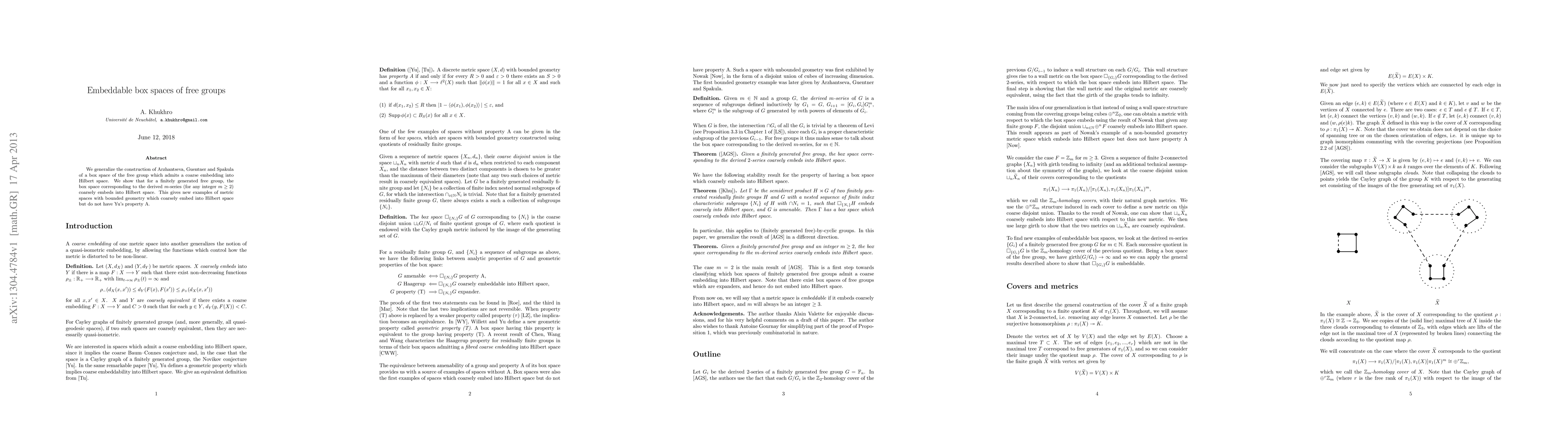 This paper shows that box spaces corresponding to finitely generated free groups admit coarse embeddings into Hilbert space for the derived m-series, providing new examples of metric spaces with bounded geometry.