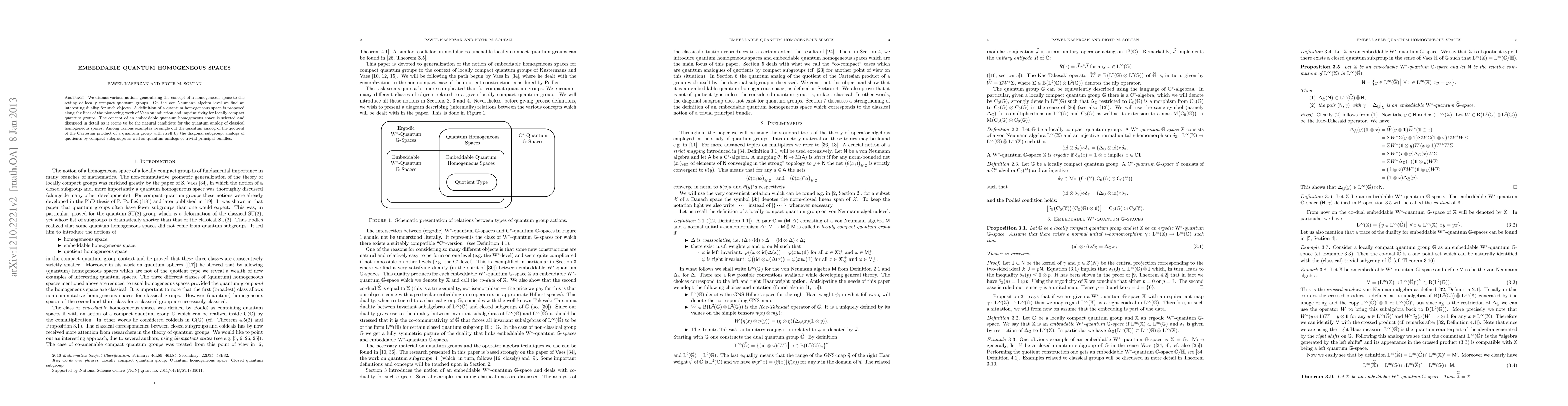 This paper proposes a definition for quantum homogeneous spaces within the framework of locally compact quantum groups, focusing on embeddable quantum homogeneous spaces as the quantum analog of classical homogeneous spaces. It also explores various examples, including quantum analogs of quotients by compact subgroups and trivial principal bundles.