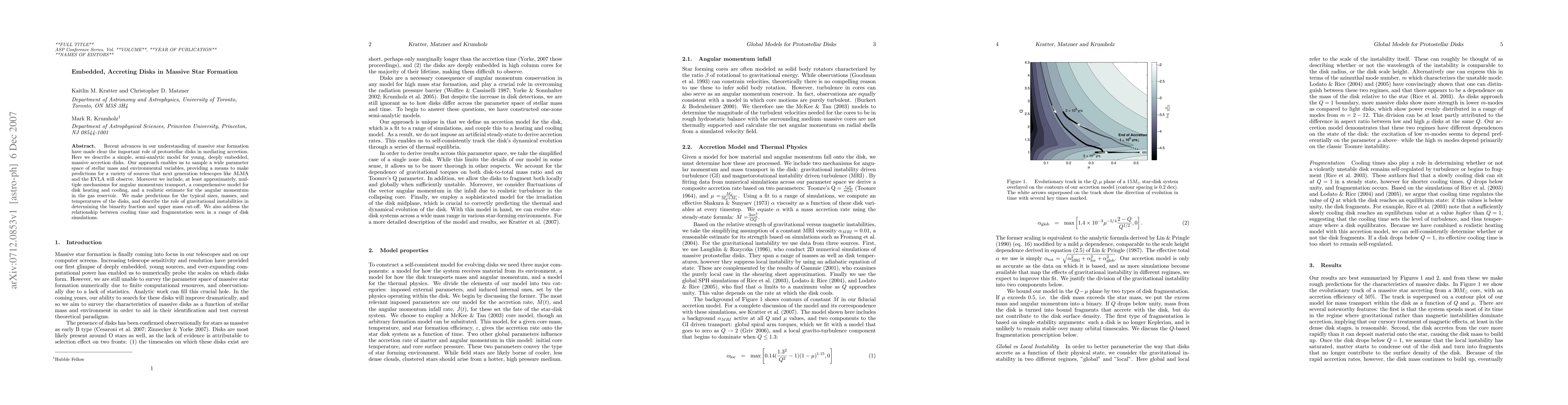 This paper presents a semi-analytic model for deeply embedded, massive accretion disks in star formation, incorporating angular momentum transport, heating, and cooling mechanisms. The model predicts disk sizes, masses, and temperatures, and explores the influence of gravitational instabilities on binarity and mass limits.