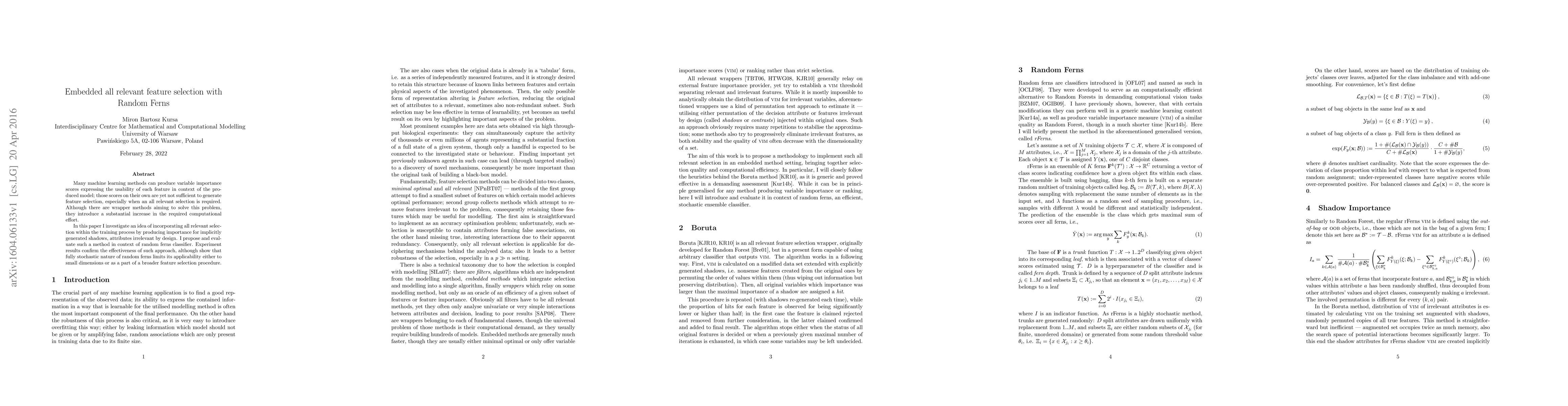 Many machine learning methods can produce variable importance scores expressing the usability of each feature in context of the produced model; those scores on their own are yet not sufficient to generate feature selection, especially when an all relevant selection is required. Although there are wrapper methods aiming to solve this problem, they introduce a substantial increase in the required computational effort. In this paper I investigate an idea of incorporating all relevant selection within the training process by producing importance for implicitly generated shadows, attributes irrelevant by design. I propose and evaluate such a method in context of random ferns classifier. Experiment results confirm the effectiveness of such approach, although show that fully stochastic nature of random ferns limits its applicability either to small dimensions or as a part of a broader feature selection procedure.