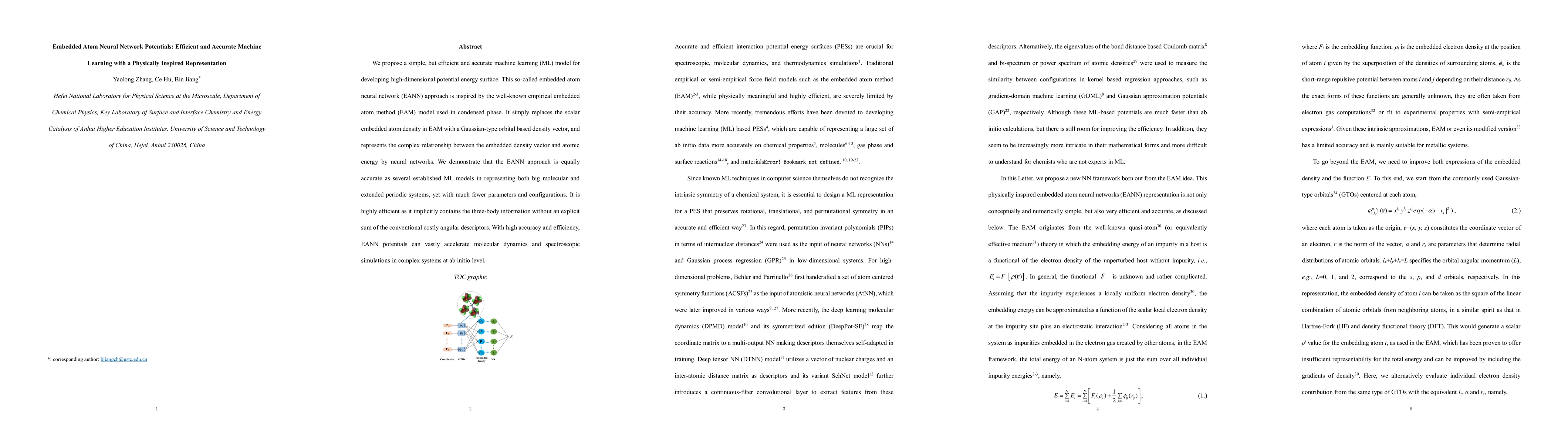 This paper proposes an embedded atom neural network (EANN) model, inspired by the empirical embedded atom method, to efficiently represent high-dimensional potential energy surfaces. The EANN approach uses neural networks to replace the scalar density in EAM with a Gaussian-type orbital density vector, achieving high accuracy with fewer parameters and configurations while implicitly incorporating three-body information.