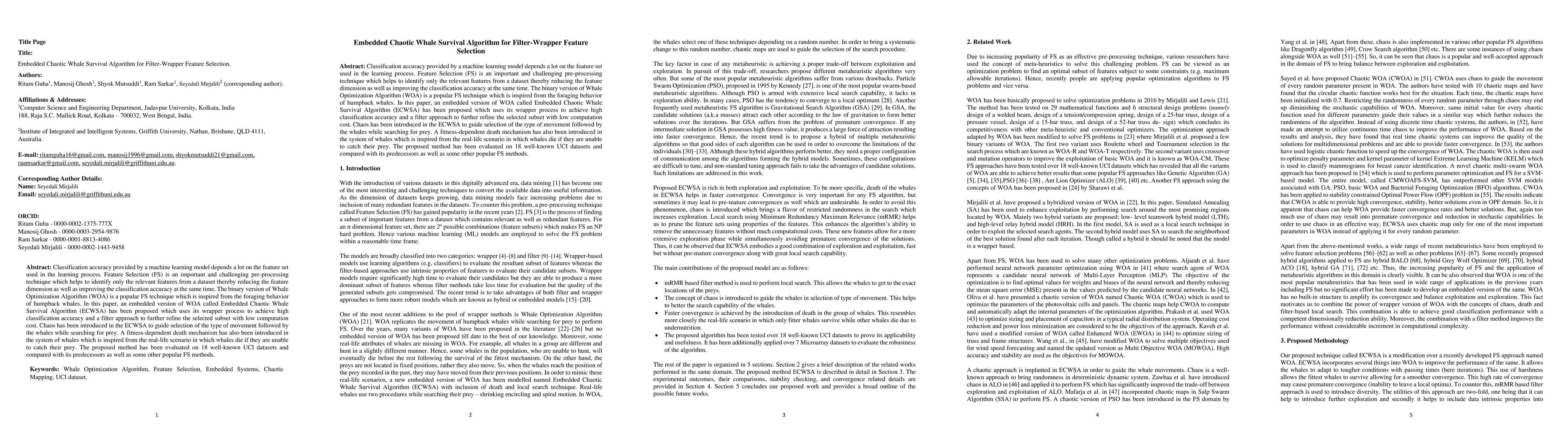 This paper proposes an Embedded Chaotic Whale Survival Algorithm (ECWSA) for feature selection, combining a wrapper and filter approach to enhance classification accuracy while minimizing computational costs. The ECWSA incorporates chaos theory to guide whale movement and a death mechanism based on fitness to simulate real-life survival scenarios, and is evaluated against other methods on 18 UCI datasets.