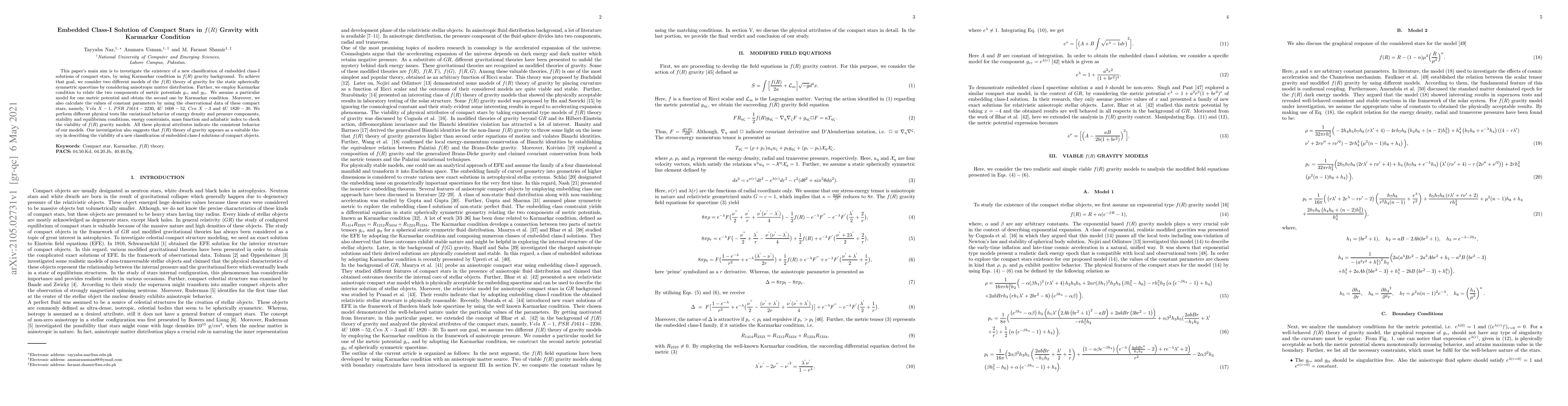 This paper explores new embedded class-I solutions for compact stars in $f(R)$ gravity using the Karmarkar condition, finding consistent physical behavior and viability for these models through various tests and observational data. The study suggests $f(R)$ gravity as a plausible theory for describing these compact star classifications.