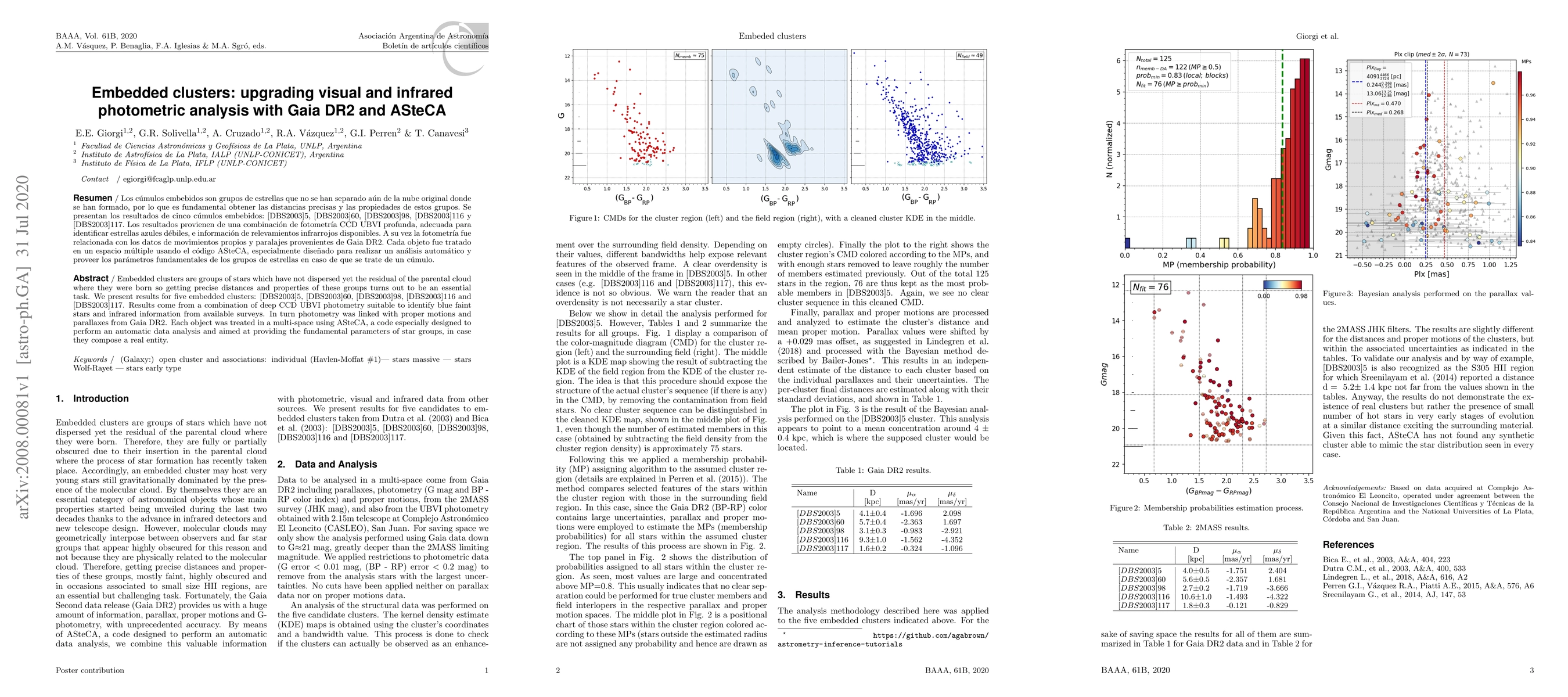 Embedded clusters are groups of stars which have not dispersed yet the residual of the parental cloud where they were born so getting precise distances and properties of these groups turns out to be an essential task. We present results for five embedded clusters: [DBS2003]5, [DBS2003]60, [DBS2003]98, [DBS2003]116 and [DBS2003]117. Results come from a combination of deep CCD UBVI photometry suitable to identify blue faint stars and infrared information from available surveys. In turn photometry was linked with proper motions and parallaxes from Gaia DR2. Each object was treated in a multi-space using ASteCA, a code especially designed to perform an automatic data analysis and aimed at providing the fundamental parameters of star groups, in case they compose a real entity.