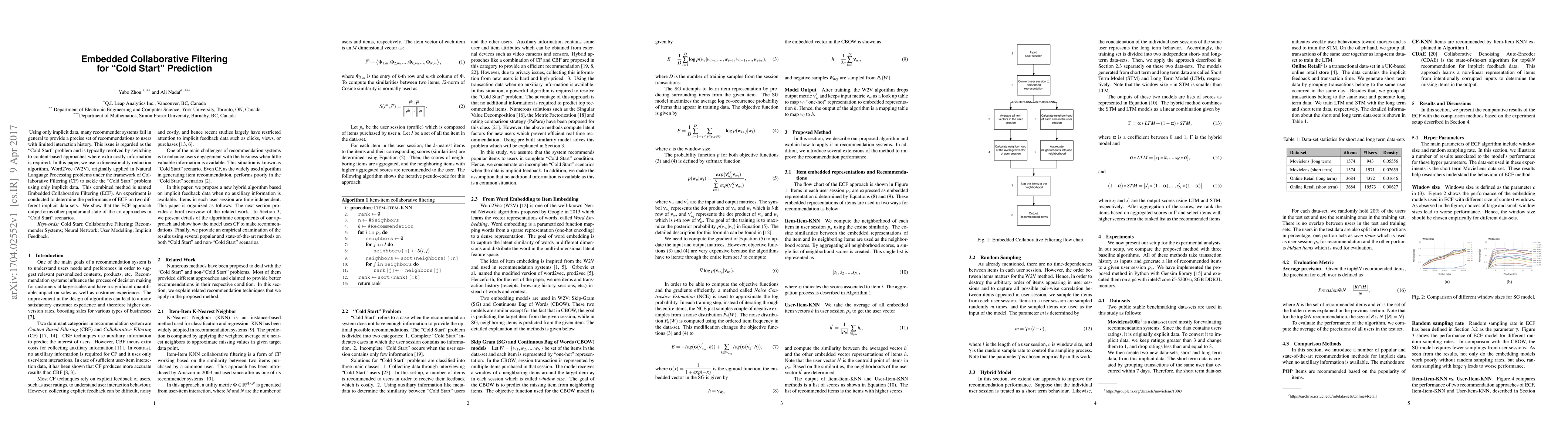 This paper proposes Embedded Collaborative Filtering (ECF) to address the "Cold Start" problem in recommender systems using only implicit data. By employing Word2Vec within a Collaborative Filtering framework, ECF outperforms other methods in providing recommendations for users with limited interaction history.