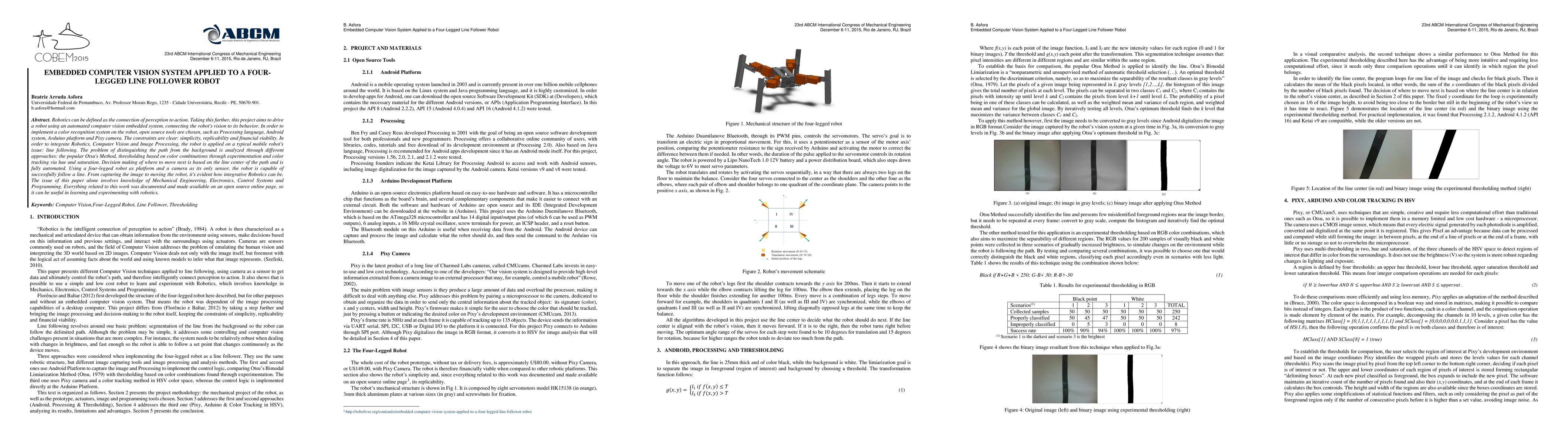A robot follows a line using an embedded computer vision system that uses a Pixy camera, Processing language, and Android system to track the color of the line and make decisions on its movement. The system successfully navigates the robot around obstacles and tracks the line with high accuracy.