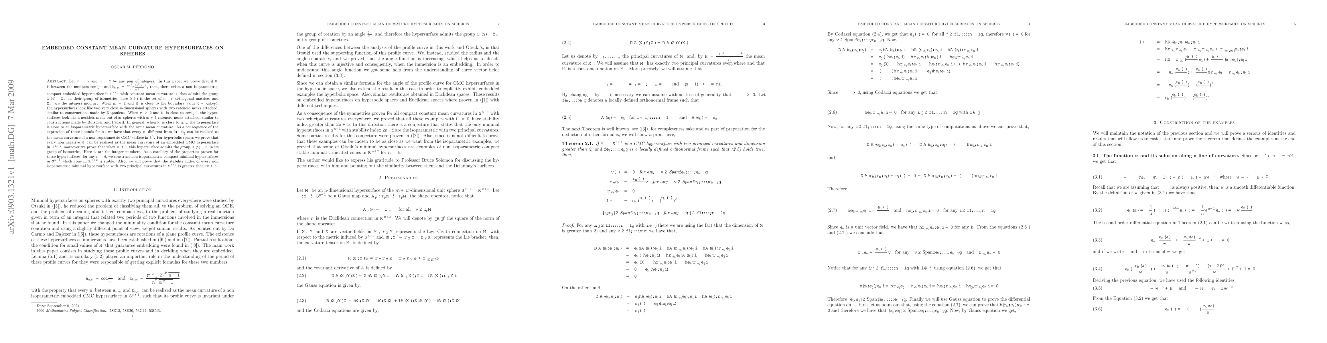 Let m>1 and n>1 be any pair of integers. In this paper we prove that if H is between the numbers \cot(\frac{\pi}{m}) and b_{m,n}=\frac{(m^2-2)\sqrt{n-1}}{n\sqrt{m^2-1}}, then, there exists a non isoparametric, compact embedded hypersurface in S^{n+1} with constant mean curvature H that admits the group O(n)x Z_m in their group of isometries, here O(n) is the set of n x n orthogonal matrices and Z_m are the integers mod m. When m=2 and H is close to the boundary value 0, the hypersurfaces look like two very close n-dimensional spheres with two catenoid necks attached, similar to constructions made by Kapouleas. When m>2 and H is close to \cot(\frac{\pi}{m}), the hypersurfaces look like a necklets made out of m spheres with (m+1) catenoid necks attached, similar to constructions made by Butscher and Pacard. In general, when H is close to b_{m,n} the hypersurface is close to an isoparametric hypersurface with the same mean curvature. As a consequence of the expression of these bounds for H, we have that every H different from 0,\pm\frac{1}{\sqrt{3}} can be realized as the mean curvature of a non isoparametric CMC surface in S^3. For hyperbolic spaces we prove that every non negative H can be realized as the mean curvature of an embedded CMC hypersurface in H^{n+1}, moreover we prove that when H>1 this hypersurface admits the group O(n)\times Z in its group of isometries. Here Z are the integer numbers. As a corollary of the properties proven for these hypersurfaces, for any n> 5, we construct non isoparametric compact minimal hypersurfaces in S^{n+1} which cone in R^{n+2} is stable. Also, we will prove that the stability index of every non isoparametric minimal hypersurface with two principal curvatures in S^{n+1} is greater than 2n+5.