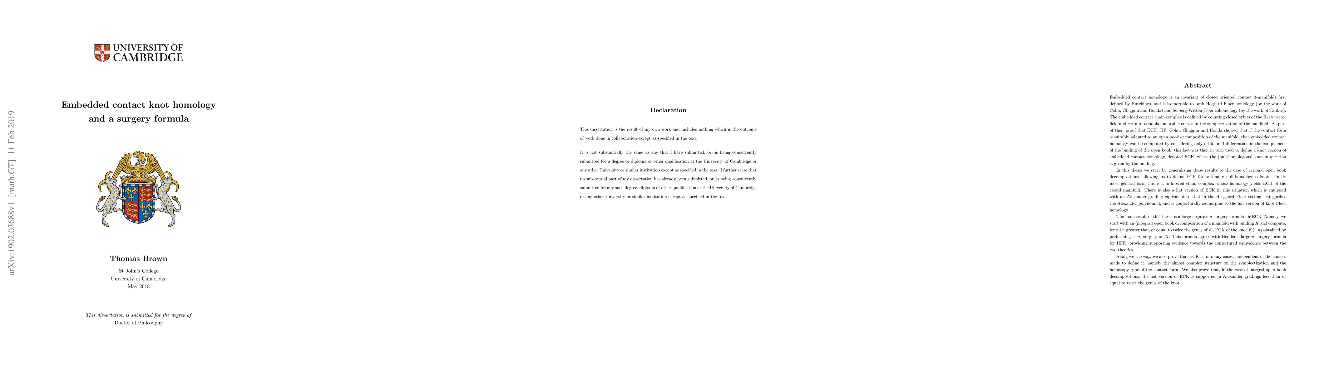 Embedded contact knot homology (ECK) is a variation on Embedded contact homology (ECH), defined with respect to an open book decomposition compatible with a contact structure on some 3-manifold, M. The knot in question is given by the (null-homologous) binding of the open book and the chain complex is defined in terms of closed orbits of the Reeb vector field and certain pseudoholomorphic curves in the symplectization of the knot complement. In this thesis we first generalize this construction to the case of rational open book decompositions, allowing us to define ECK for rationally null-homologous knots. In its most general form this is a bi-filtered chain complex whose homology yields ECH of the closed manifold. There is also a hat version of ECK in this situation which is equipped with an Alexander grading equivalent to that in the Heegaard Floer setting, categorifies the Alexander polynomial, and is conjecturally isomorphic to the hat version of knot Floer homology, HFK. The main result of this thesis is a large negative n-surgery formula for ECK. Namely, we start with an (integral) open book decomposition of a manifold with binding K and compute, for large n, ECK of the knot K(-n) obtained by performing (-n)-surgery on K. This formula agrees with Hedden's large n-surgery formula for HFK, providing supporting evidence towards the conjectured equivalence between the two theories. Along the way, we also prove that ECK is, in many cases, independent of the choices made to define it, namely the almost complex structure on the symplectization and the homotopy type of the contact form. We also prove that, in the case of integral open book decompositions, the hat version of ECK is supported in Alexander gradings less than or equal to twice the genus of the knot.