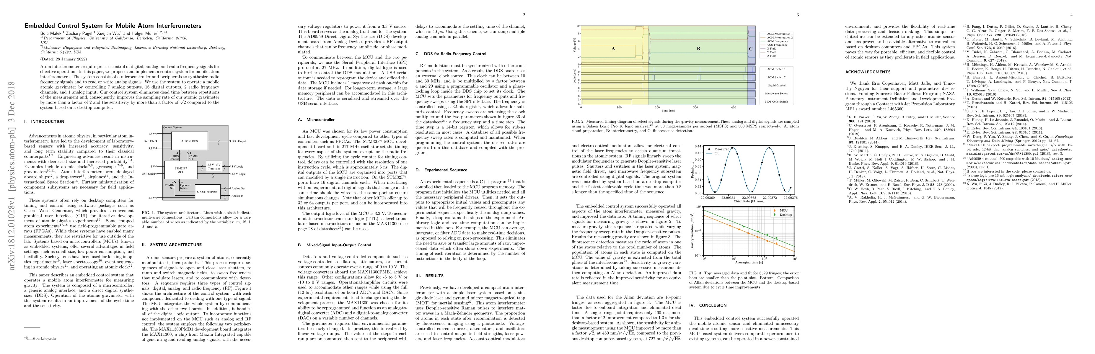 Atom interferometers require precise control of digital, analog, and radio frequency signals for effective operation. In this paper, we propose and implement a control system for mobile atom interferometers. The system consists of a microcontroller and peripherals to synthesize radio frequency signals and to read or write analog signals. We use the system to operate a mobile atomic gravimeter by controlling 7 analog outputs, 16 digital outputs, 2 radio frequency channels, and 1 analog input. Our control system eliminates dead time between repetitions of the measurement and, consequently, improves the sampling rate of our atomic gravimeter by more than a factor of 2 and the sensitivity by more than a factor of $\sqrt{2}$ compared to the system based on a desktop computer.