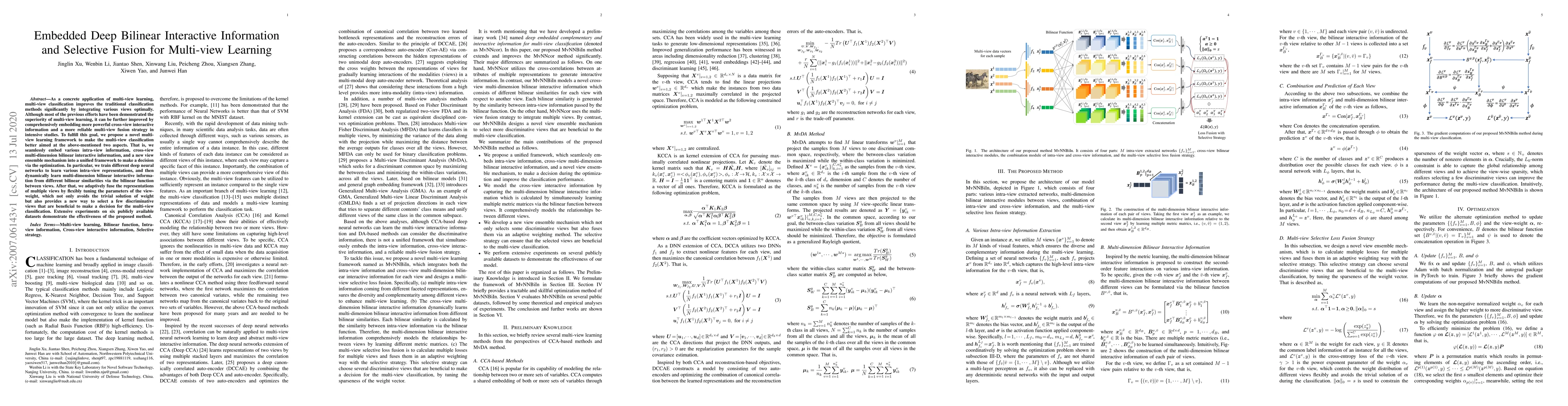 This paper proposes a novel multi-view learning framework that integrates intra-view information, cross-view bilinear interactions, and a selective fusion mechanism to enhance multi-view classification. The method adaptively fuses view representations using view-weight tuning, improving classification performance over traditional methods.