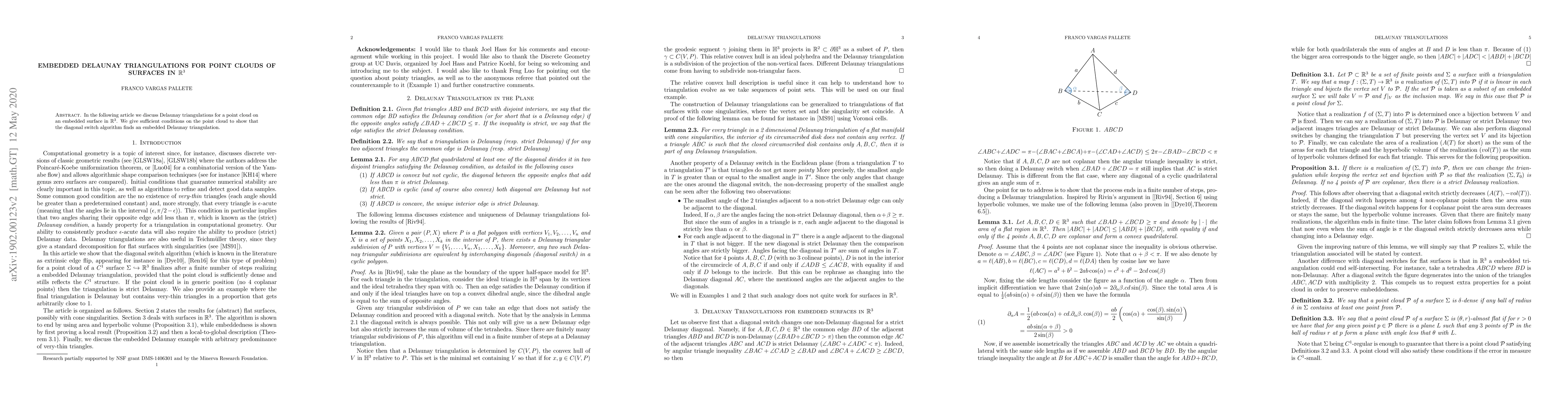 In the following article we discuss Delaunay triangulations for a point cloud on an embedded surface in $\mathbb{R}^3$. We give sufficient conditions on the point cloud to show that the diagonal switch algorithm finds an embedded Delaunay triangulation.