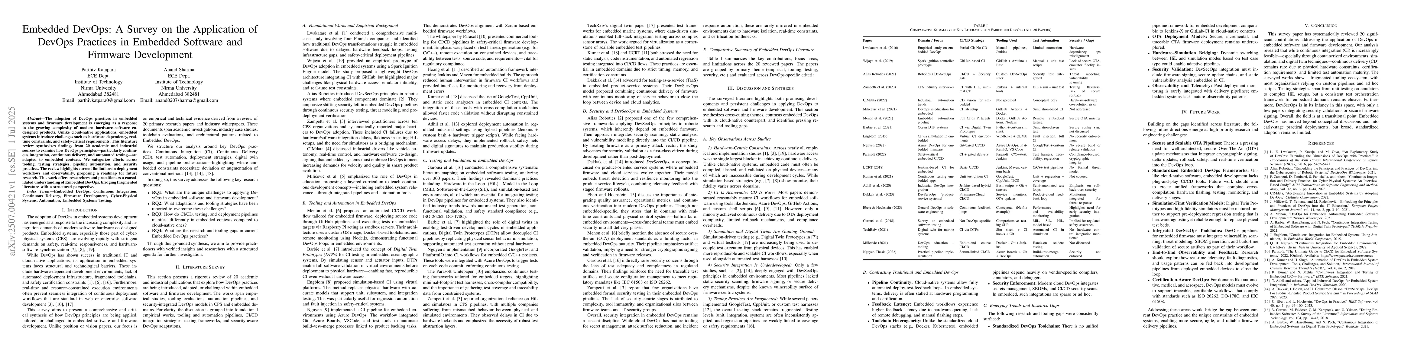 The adoption of DevOps practices in embedded systems and firmware development is emerging as a response to the growing complexity of modern hardware--software co-designed products. Unlike cloud-native applications, embedded systems introduce challenges such as hardware dependency, real-time constraints, and safety-critical requirements. This literature review synthesizes findings from 20 academic and industrial sources to examine how DevOps principles--particularly continuous integration, continuous delivery, and automated testing--are adapted to embedded contexts. We categorize efforts across tooling, testing strategies, pipeline automation, and security practices. The review highlights current limitations in deployment workflows and observability, proposing a roadmap for future research. This work offers researchers and practitioners a consolidated understanding of Embedded DevOps, bridging fragmented literature with a structured perspective.