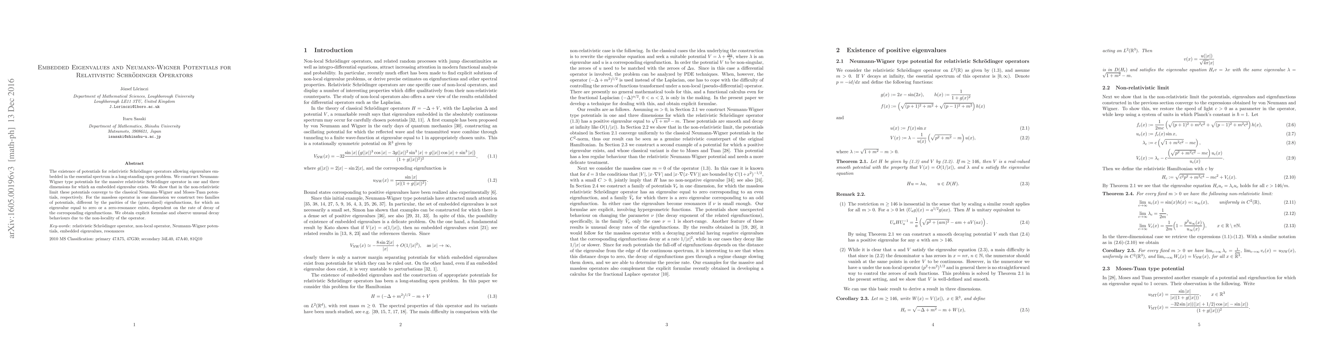This paper constructs Neumann-Wigner potentials for relativistic Schrödinger operators in one and three dimensions, demonstrating the existence of embedded eigenvalues. It also explores the non-relativistic limit and the behavior of massless operators, revealing unique decay patterns due to the operator's non-locality.