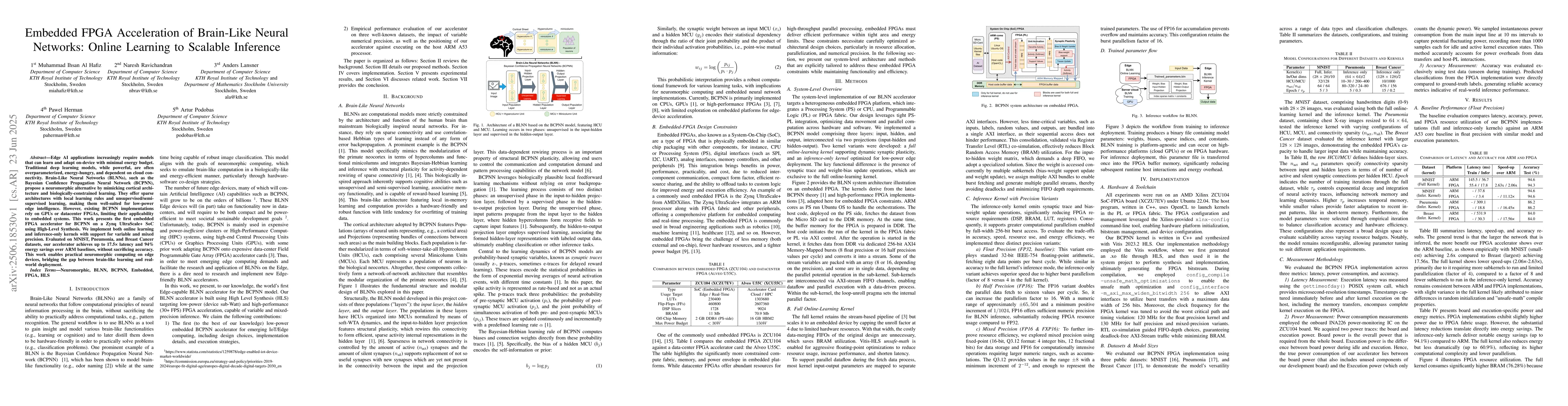 Edge AI applications increasingly require models that can learn and adapt on-device with minimal energy budget. Traditional deep learning models, while powerful, are often overparameterized, energy-hungry, and dependent on cloud connectivity. Brain-Like Neural Networks (BLNNs), such as the Bayesian Confidence Propagation Neural Network (BCPNN), propose a neuromorphic alternative by mimicking cortical architecture and biologically-constrained learning. They offer sparse architectures with local learning rules and unsupervised/semi-supervised learning, making them well-suited for low-power edge intelligence. However, existing BCPNN implementations rely on GPUs or datacenter FPGAs, limiting their applicability to embedded systems. This work presents the first embedded FPGA accelerator for BCPNN on a Zynq UltraScale+ SoC using High-Level Synthesis. We implement both online learning and inference-only kernels with support for variable and mixed precision. Evaluated on MNIST, Pneumonia, and Breast Cancer datasets, our accelerator achieves up to 17.5x latency and 94% energy savings over ARM baselines, without sacrificing accuracy. This work enables practical neuromorphic computing on edge devices, bridging the gap between brain-like learning and real-world deployment.