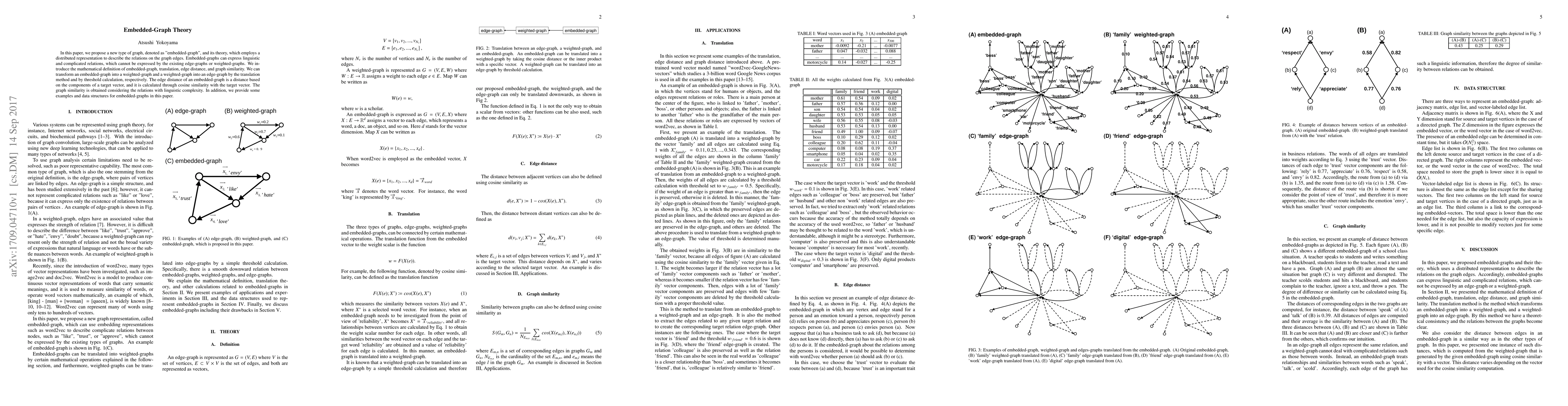 In this paper, we propose a new type of graph, denoted as "embedded-graph", and its theory, which employs a distributed representation to describe the relations on the graph edges. Embedded-graphs can express linguistic and complicated relations, which cannot be expressed by the existing edge-graphs or weighted-graphs. We introduce the mathematical definition of embedded-graph, translation, edge distance, and graph similarity. We can transform an embedded-graph into a weighted-graph and a weighted-graph into an edge-graph by the translation method and by threshold calculation, respectively. The edge distance of an embedded-graph is a distance based on the components of a target vector, and it is calculated through cosine similarity with the target vector. The graph similarity is obtained considering the relations with linguistic complexity. In addition, we provide some examples and data structures for embedded-graphs in this paper.