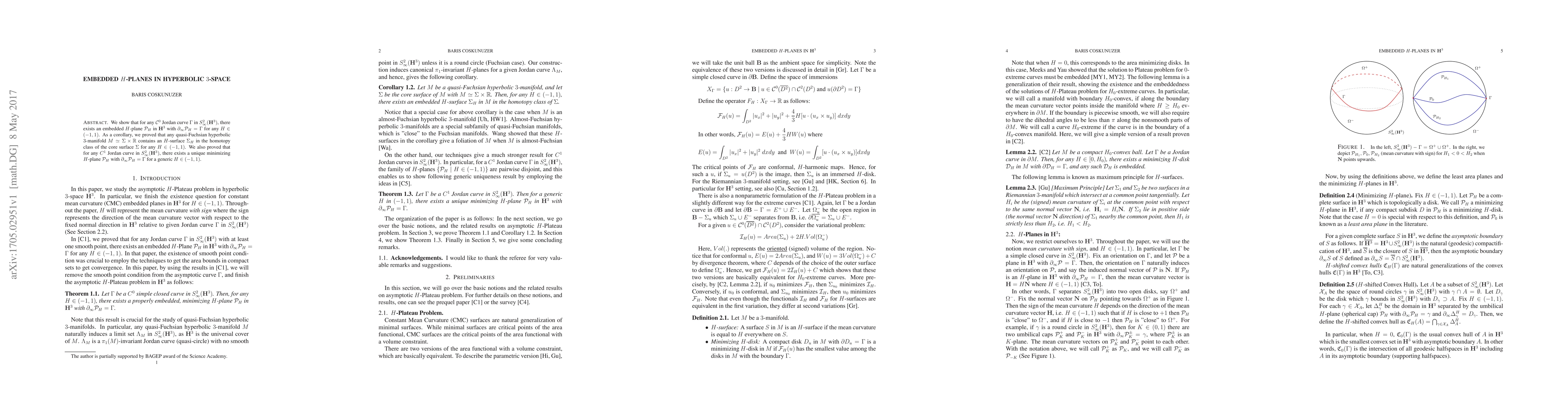 This paper demonstrates the existence of embedded $H$-planes in hyperbolic 3-space with asymptotic boundaries defined by C^0 Jordan curves, and proves that quasi-Fuchsian hyperbolic 3-manifolds contain such $H$-surfaces. Additionally, it shows the uniqueness of a minimizing $H$-plane for C^1 Jordan curves in the sphere at infinity.