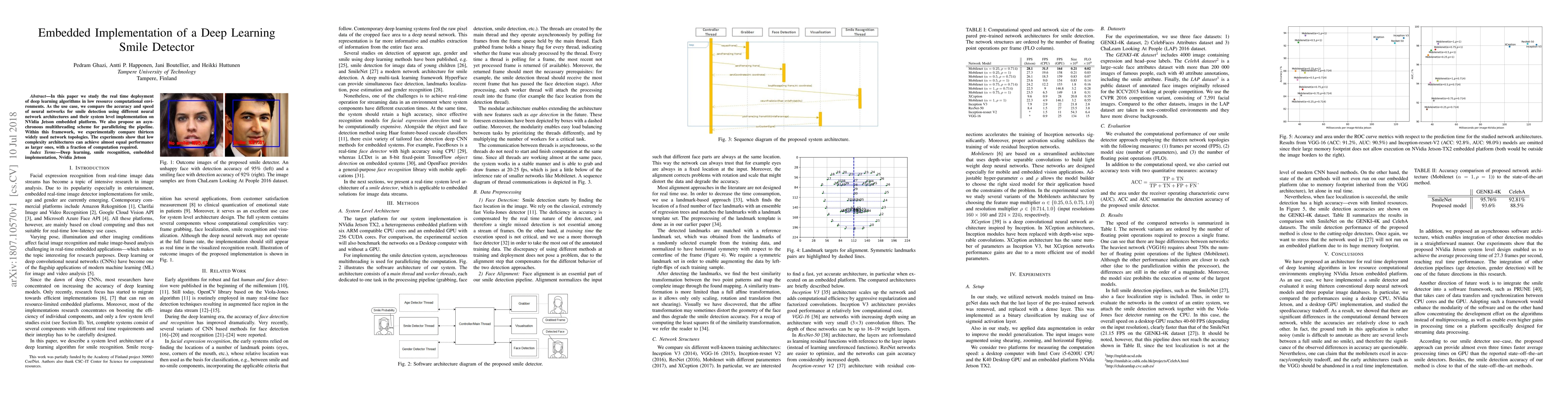 In this paper we study the real time deployment of deep learning algorithms in low resource computational environments. As the use case, we compare the accuracy and speed of neural networks for smile detection using different neural network architectures and their system level implementation on NVidia Jetson embedded platform. We also propose an asynchronous multithreading scheme for parallelizing the pipeline. Within this framework, we experimentally compare thirteen widely used network topologies. The experiments show that low complexity architectures can achieve almost equal performance as larger ones, with a fraction of computation required.