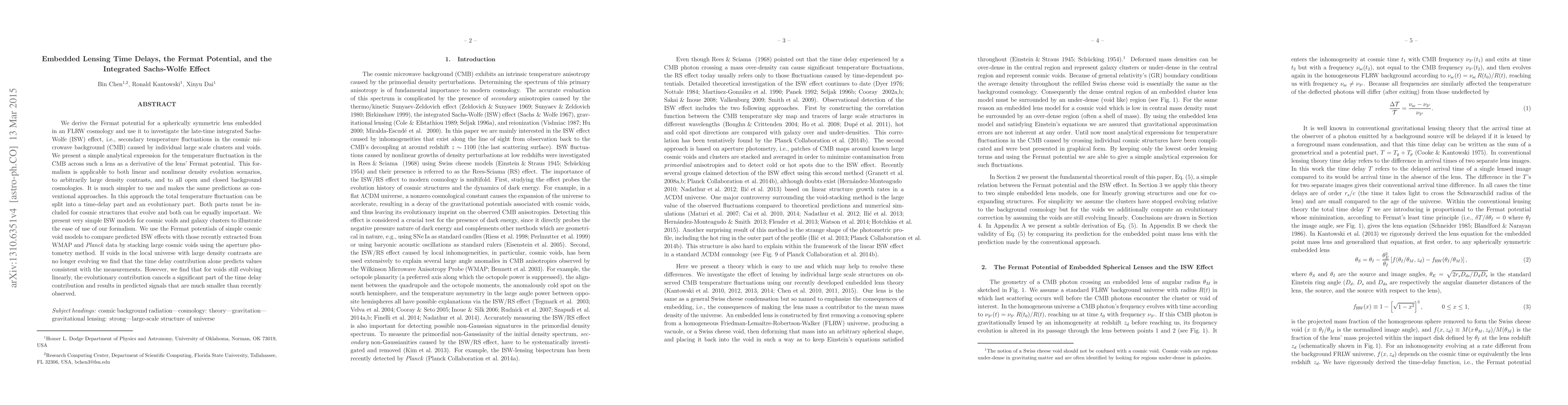 We derive the Fermat potential for a spherically symmetric lens embedded in an FLRW cosmology and use it to investigate the late-time integrated Sachs-Wolfe (ISW) effect, i.e., secondary temperature fluctuations in the cosmic microwave background (CMB) caused by individual large scale clusters and voids. We present a simple analytical expression for the temperature fluctuation in the CMB across such a lens as a derivative of the lens' Fermat potential. This formalism is applicable to both linear and nonlinear density evolution scenarios, to arbitrarily large density contrasts, and to all open and closed background cosmologies. It is much simpler to use and makes the same predictions as conventional approaches. In this approach the total temperature fluctuation can be split into a time-delay part and an evolutionary part. Both parts must be included for cosmic structures that evolve and both can be equally important. We present very simple ISW models for cosmic voids and galaxy clusters to illustrate the ease of use of our formalism. We use the Fermat potentials of simple cosmic void models to compare predicted ISW effects with those recently extracted from WMAP and \emph{Planck} data by stacking large cosmic voids using the aperture photometry method. If voids in the local universe with large density contrasts are no longer evolving we find that the time delay contribution alone predicts values consistent with the measurements. However, we find that for voids still evolving linearly, the evolutionary contribution cancels a significant part of the time delay contribution and results in predicted signals that are much smaller than recently observed.