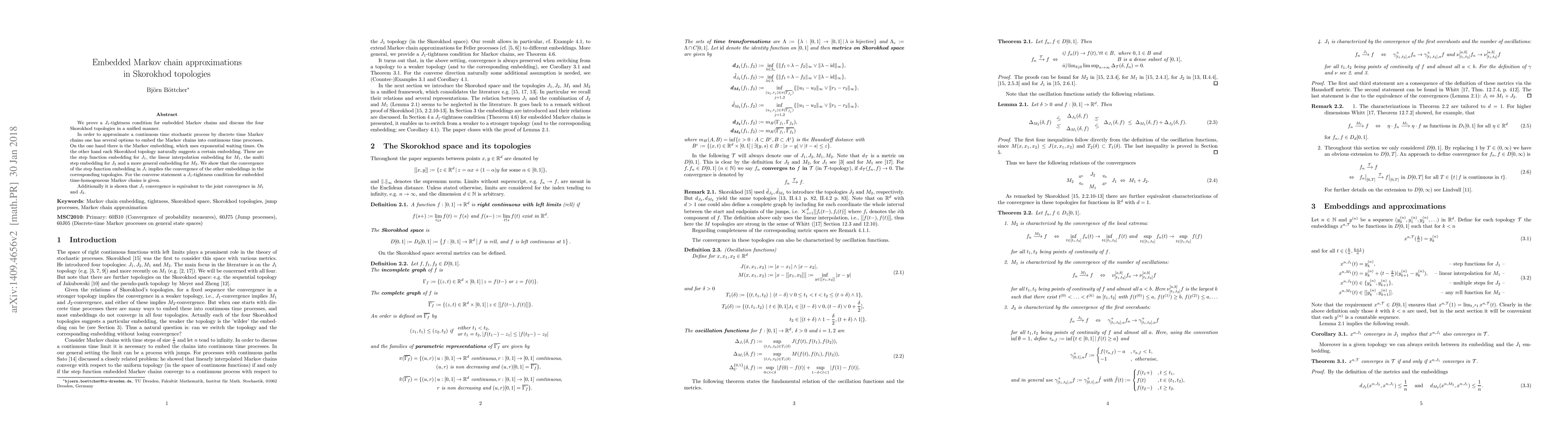 In order to approximate a continuous time stochastic process by discrete time Markov chains one has several options to embed the Markov chains into continuous time processes. On the one hand there is the Markov embedding, which uses exponential waiting times. On the other hand each Skorokhod topology naturally suggests a certain embedding. These are the step function embedding for $J_1$, the linear interpolation embedding for $M_1$, the multi step embedding for $J_2$ and a more general embedding for $M_2$. We show that the convergence of the step function embedding in $J_1$ implies the convergence of the other embeddings in the corresponding topologies, respectively. For the converse statement a $J_1$-tightness condition for embedded Markov chains is given. The result relies on various representations of the Skorokhod topologies. Additionally it is shown that $J_1$ convergence is equivalent to the joint convergence in $M_1$ and $J_2$.