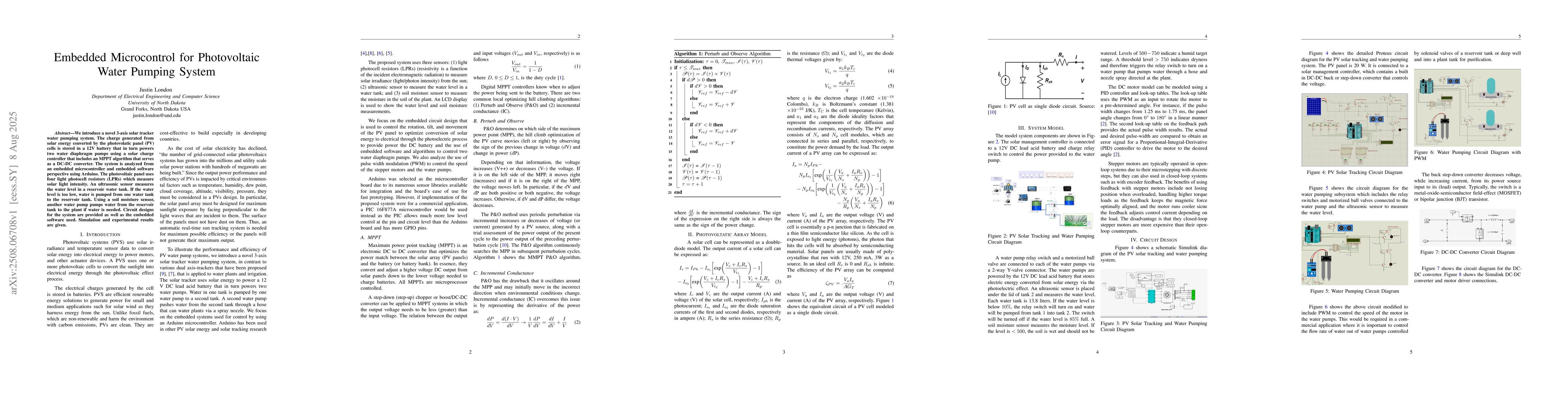 The paper presents an embedded microcontroller-based solar tracker system with efficient energy storage and distribution for water pumping, utilizing Arduino and custom-designed circuits.