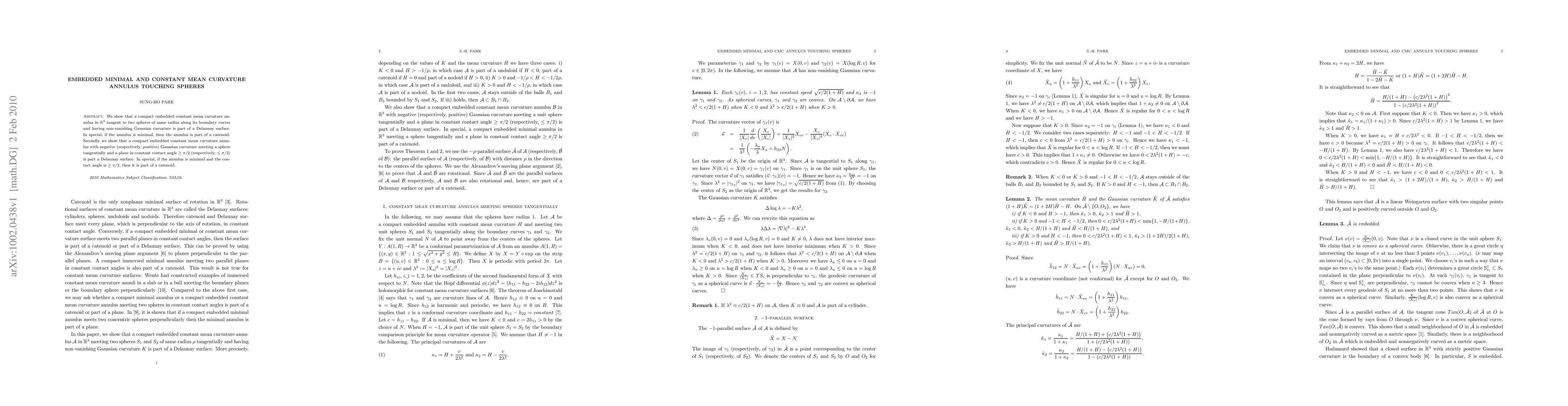 Summary: This paper demonstrates that a compact embedded minimal or constant mean curvature annulus with non-zero Gaussian curvature, tangential to two spheres of equal radius or a single sphere and a plane at a constant contact angle, is rotationally symmetric.
