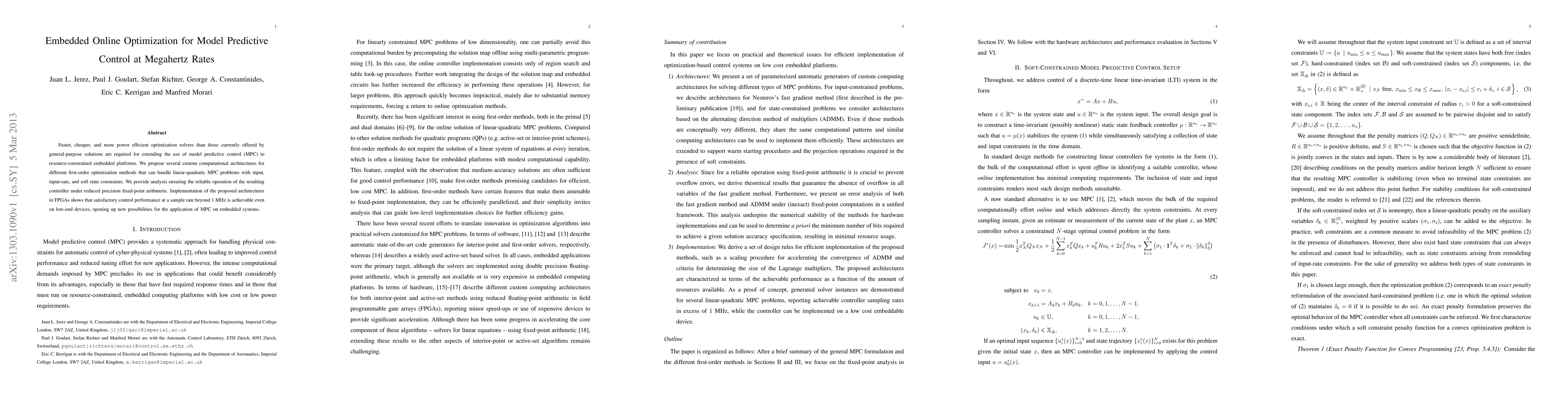 Researchers developed custom optimization architectures for model predictive control on embedded platforms, achieving satisfactory control performance at 1 MHz sample rates, expanding the use of MPC in resource-constrained systems.