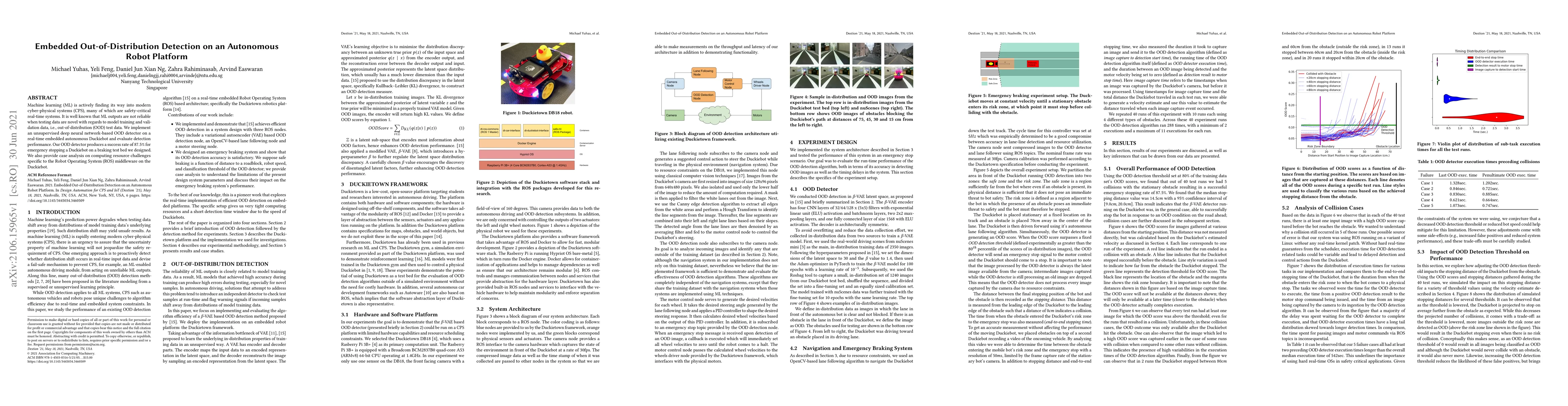 Machine learning (ML) is actively finding its way into modern cyber-physical systems (CPS), many of which are safety-critical real-time systems. It is well known that ML outputs are not reliable when testing data are novel with regards to model training and validation data, i.e., out-of-distribution (OOD) test data. We implement an unsupervised deep neural network-based OOD detector on a real-time embedded autonomous Duckiebot and evaluate detection performance. Our OOD detector produces a success rate of 87.5% for emergency stopping a Duckiebot on a braking test bed we designed. We also provide case analysis on computing resource challenges specific to the Robot Operating System (ROS) middleware on the Duckiebot.
